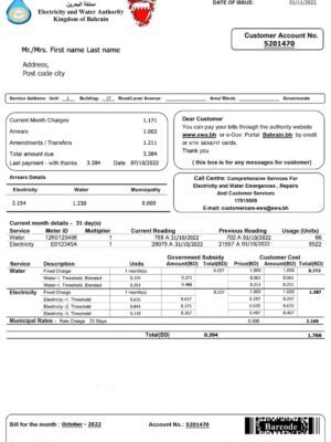 Editable Bahrain utility bill templates made for realistic verification use. Each PDF and JPG file mirrors genuine local billing styles.