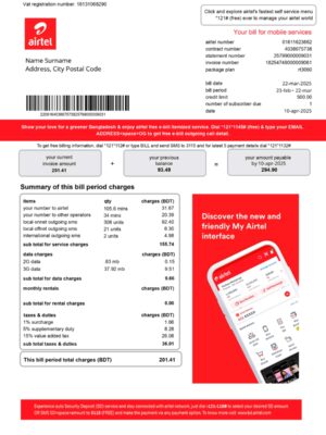 Explore editable Bangladesh utility bill templates with true-to-life visual details. Ideal for training projects and document design simulations.