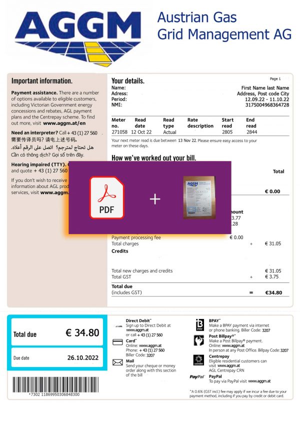 The downloadable AGGM Austria bill template includes both JPEG and PDF + JPEG formats for flexibility. Each file follows the authentic Austrian energy billing style, maintaining accurate data fields and formatting standards. Editable sections cover the full range of billing details, including user info, period dates, meter data, and totals. Every order comes with free revisions until approved, secure checkout, and full 24/7 support.