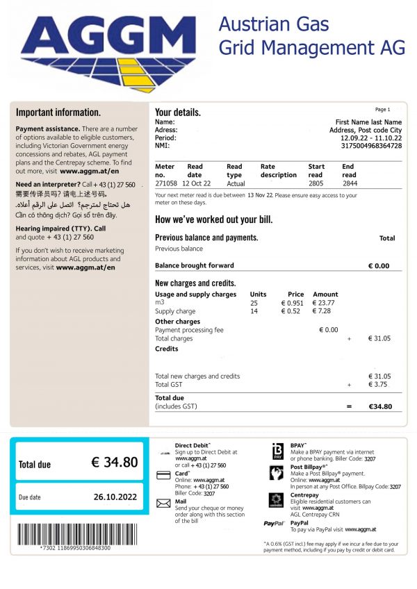 This AGGM utility bill mock-up is often compared with the EVN Energy version and the Verbund AG Energy template, both known for exceptional realism and editable layouts suited for address verification visuals.