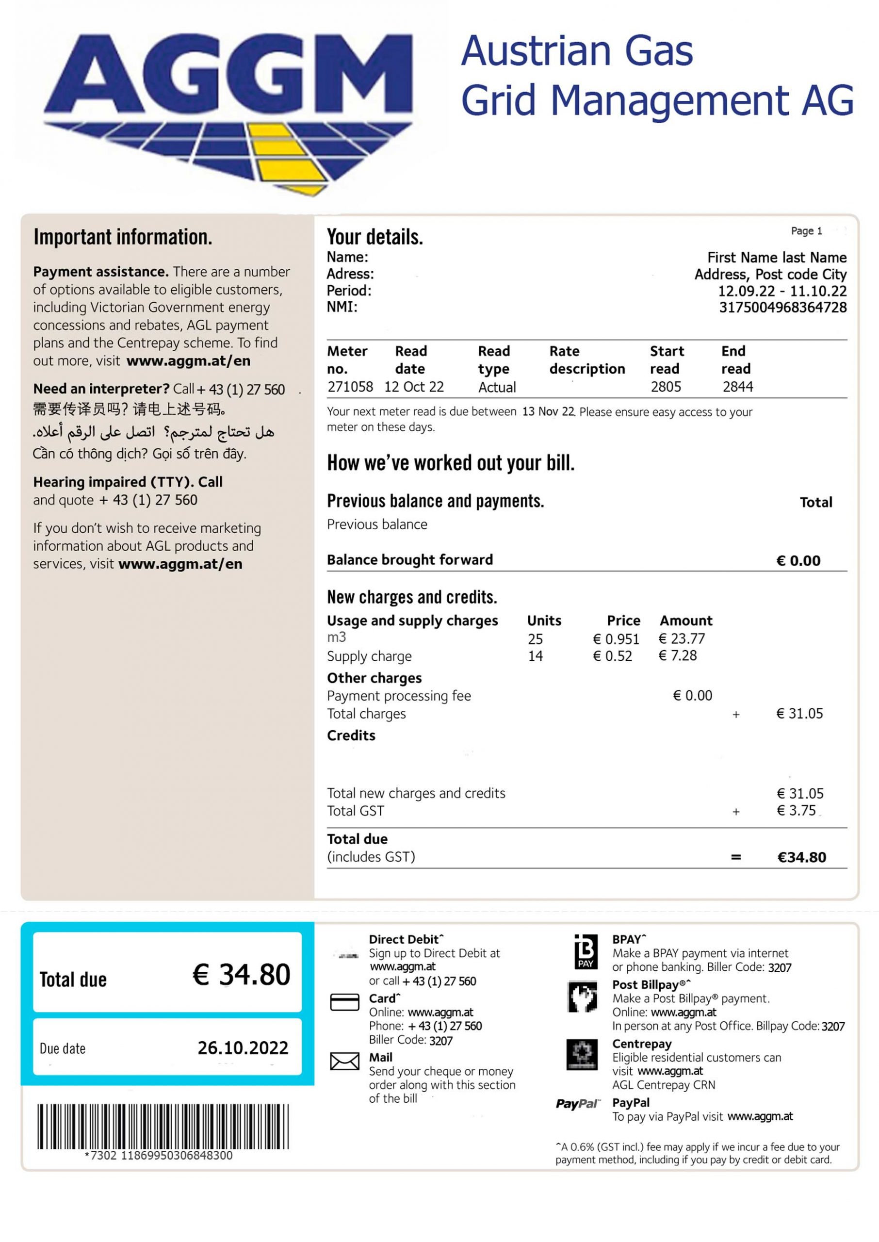You can edit all major fields — name, address, billing cycle, consumption lines, and totals — while keeping the official AGGM layout. The template works seamlessly with PDF editors and Photoshop for optional fine adjustments.