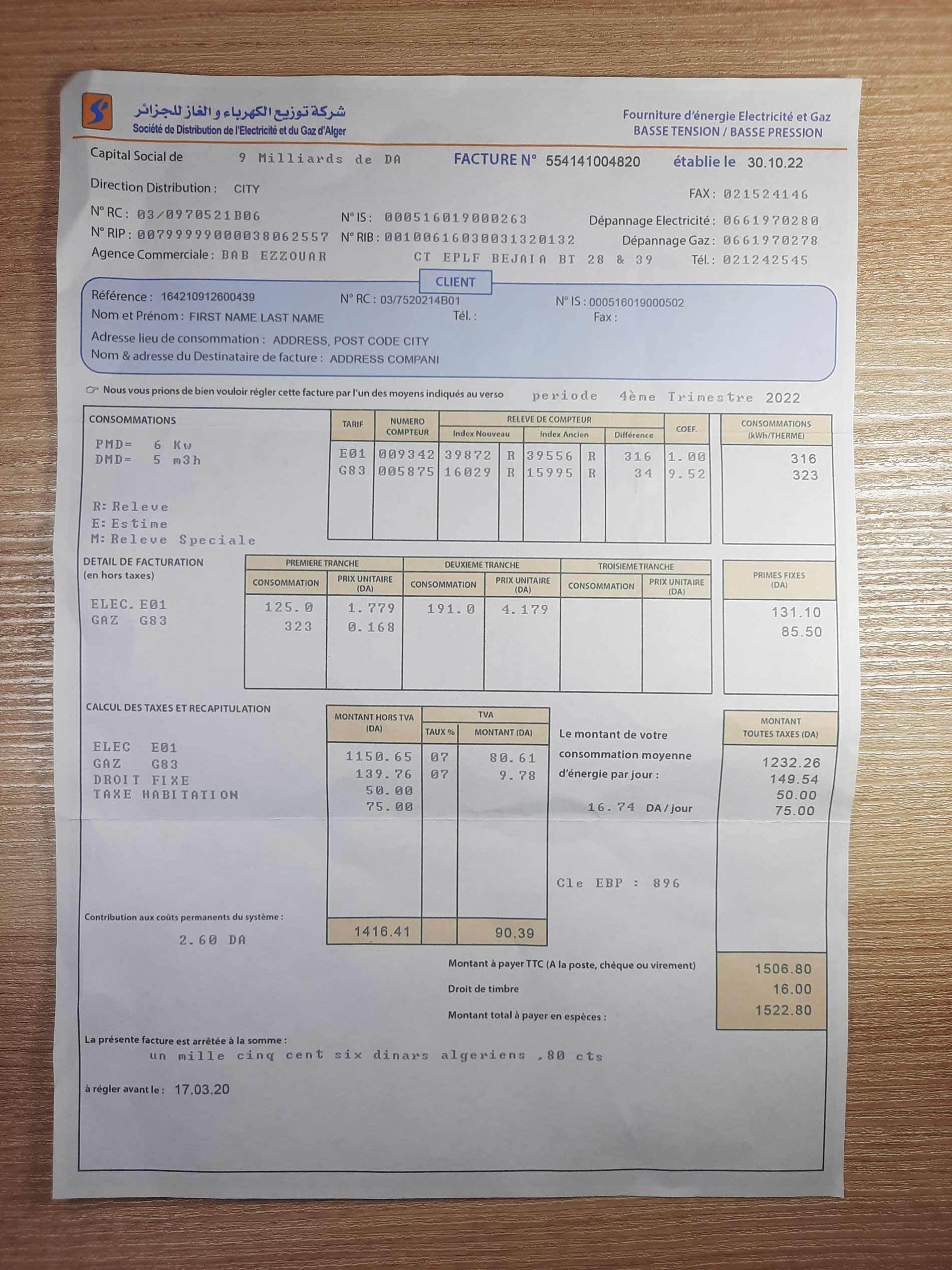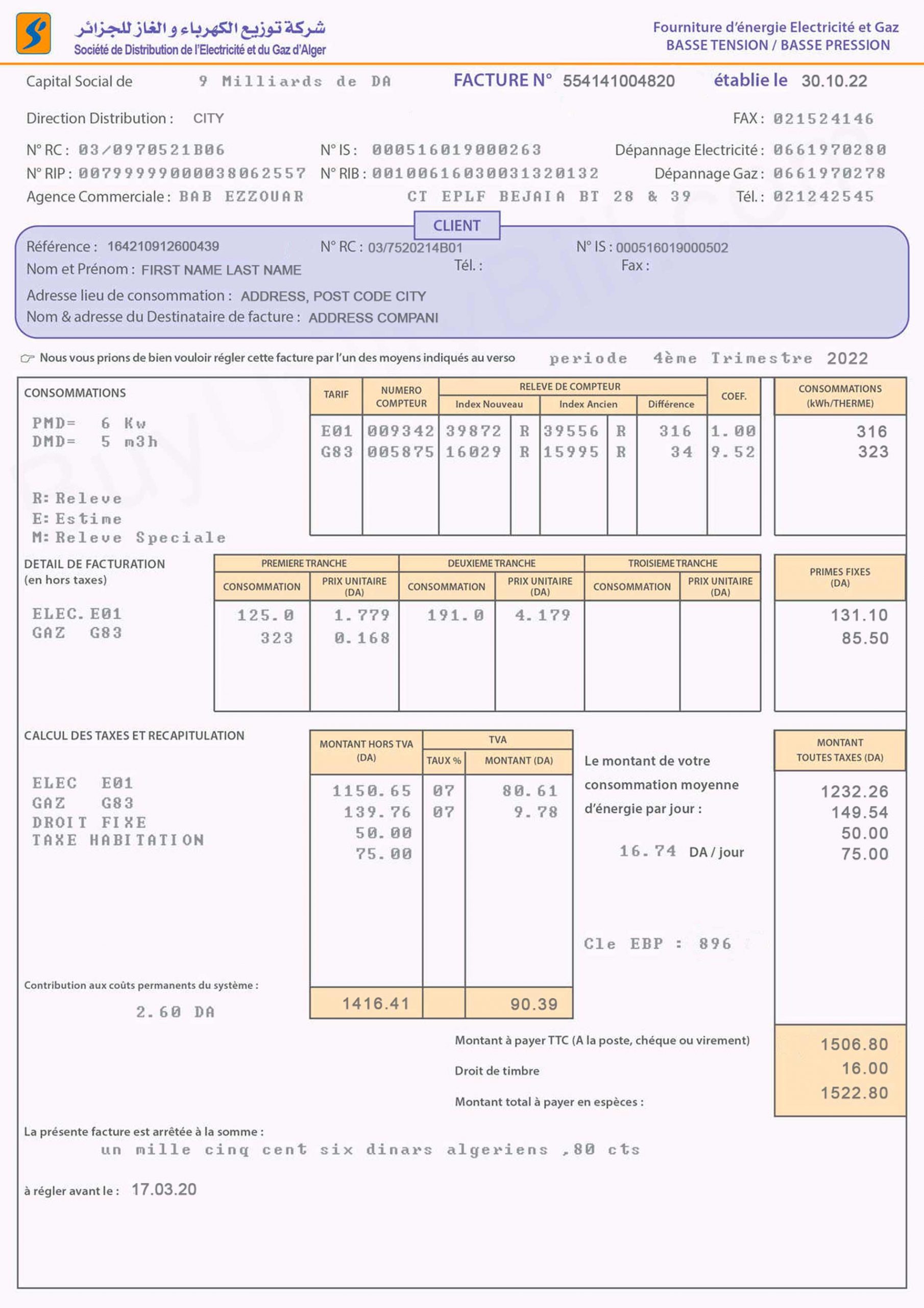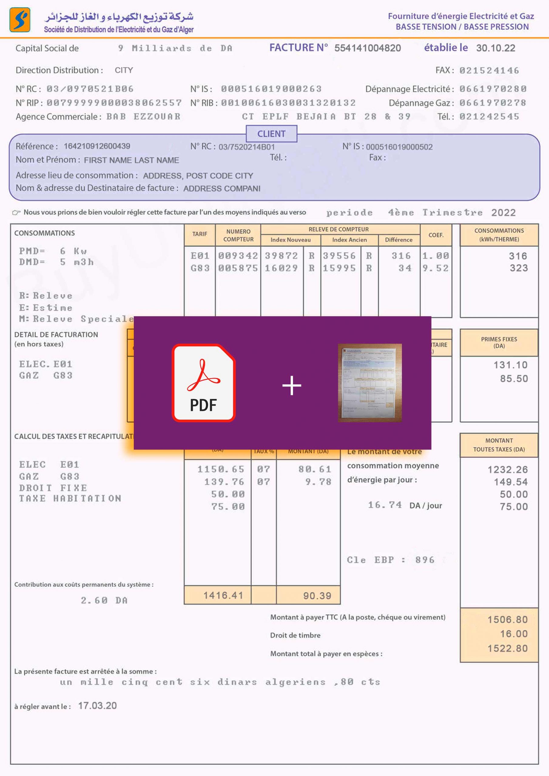 This file is suitable for all types of verifications. For example: for sites like paypal, payoner, paxful, binance, bets and poker web sites This Algeria utility bill template can be used for: