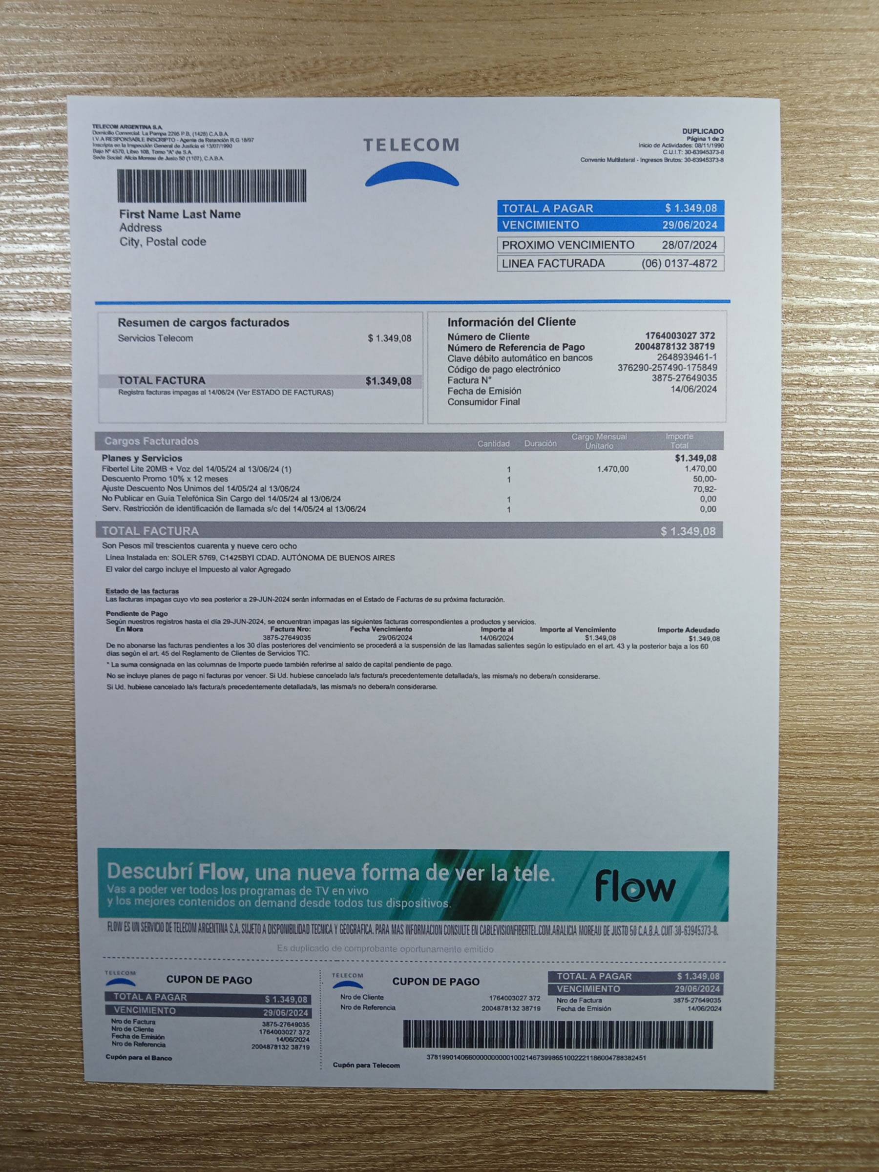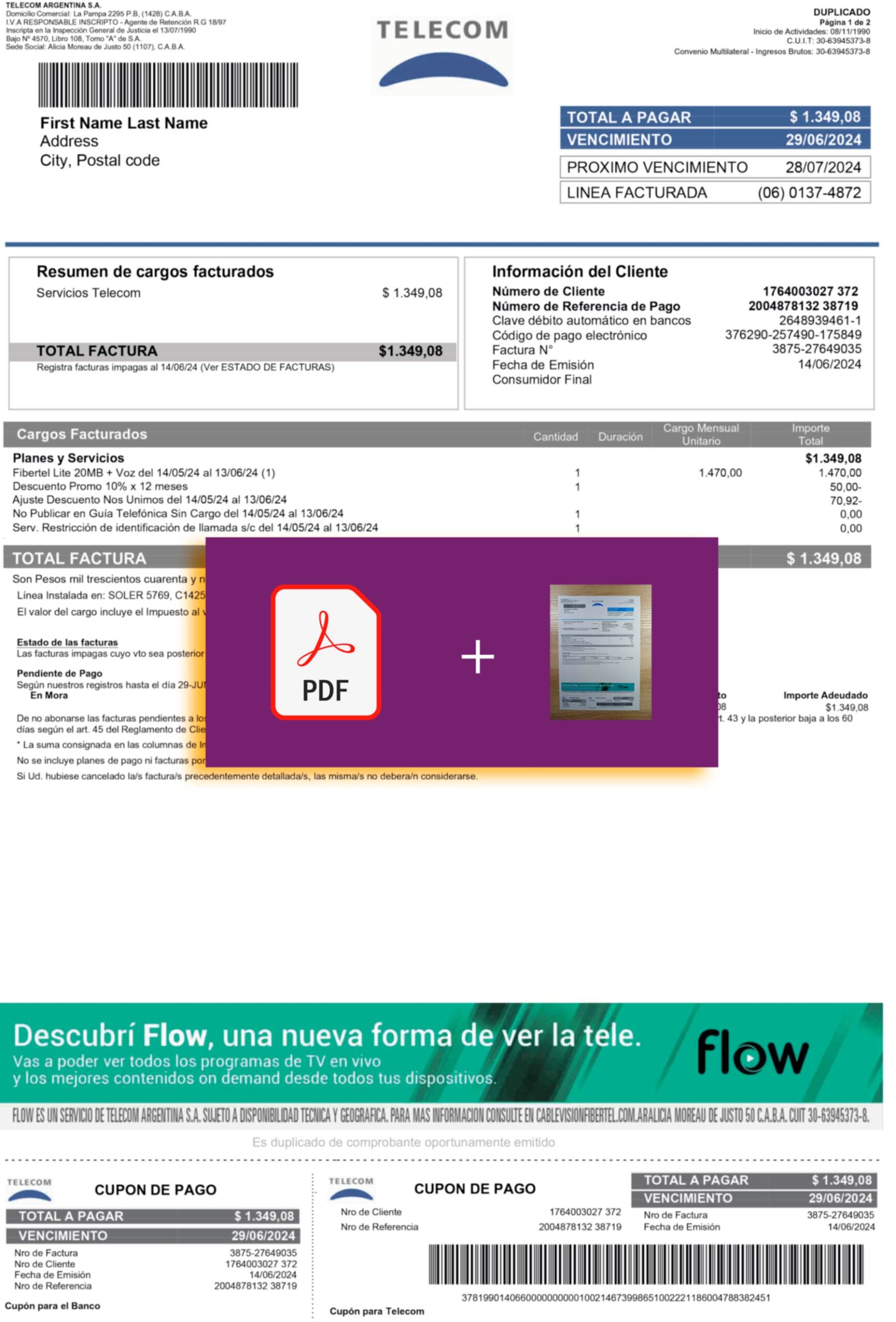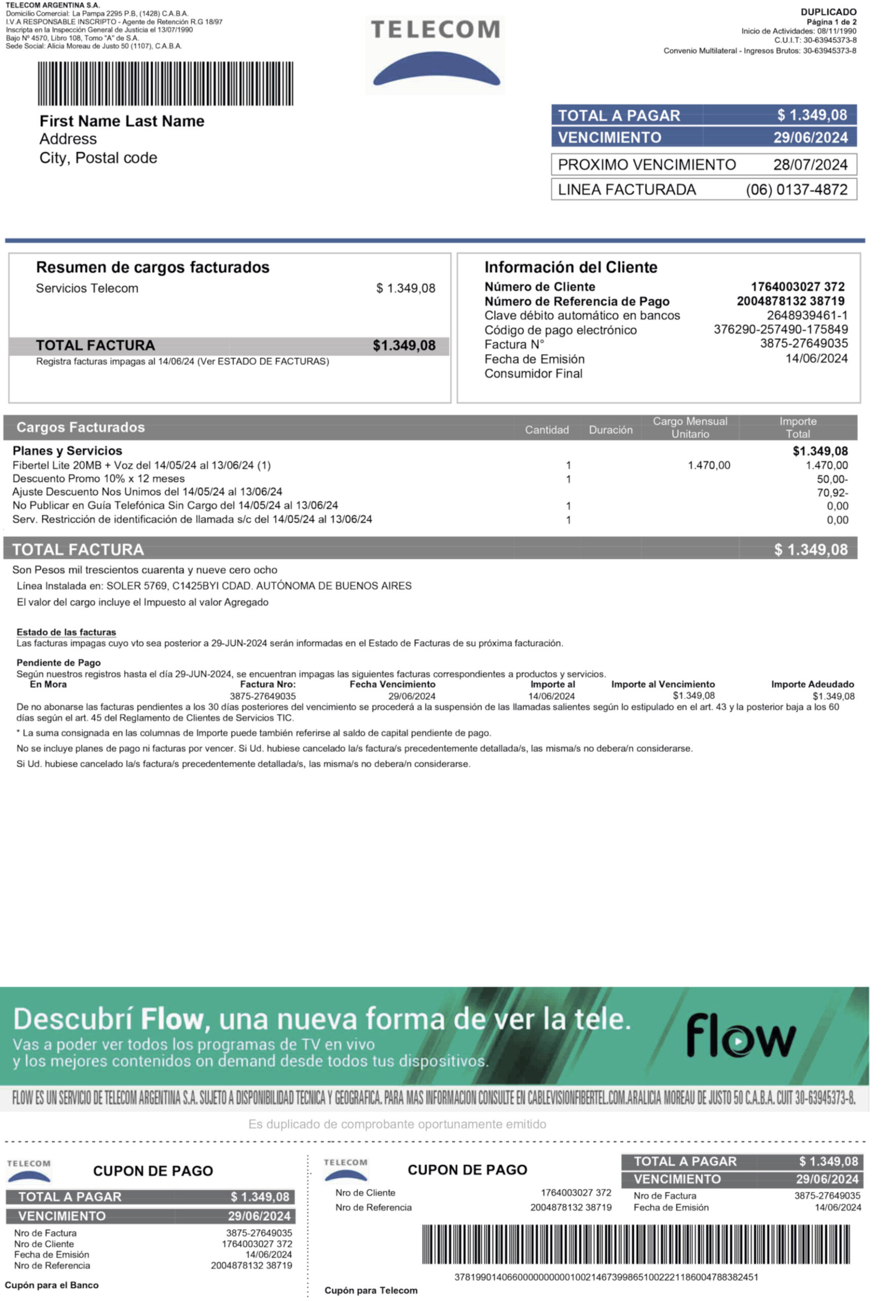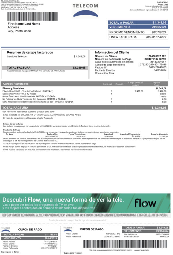 This editable Telecom Argentina bill is designed strictly for lawful and compliance-based purposes such as proof-of-address verification, UX/UI testing, and documentation previews. It supports ethical and transparent use only.