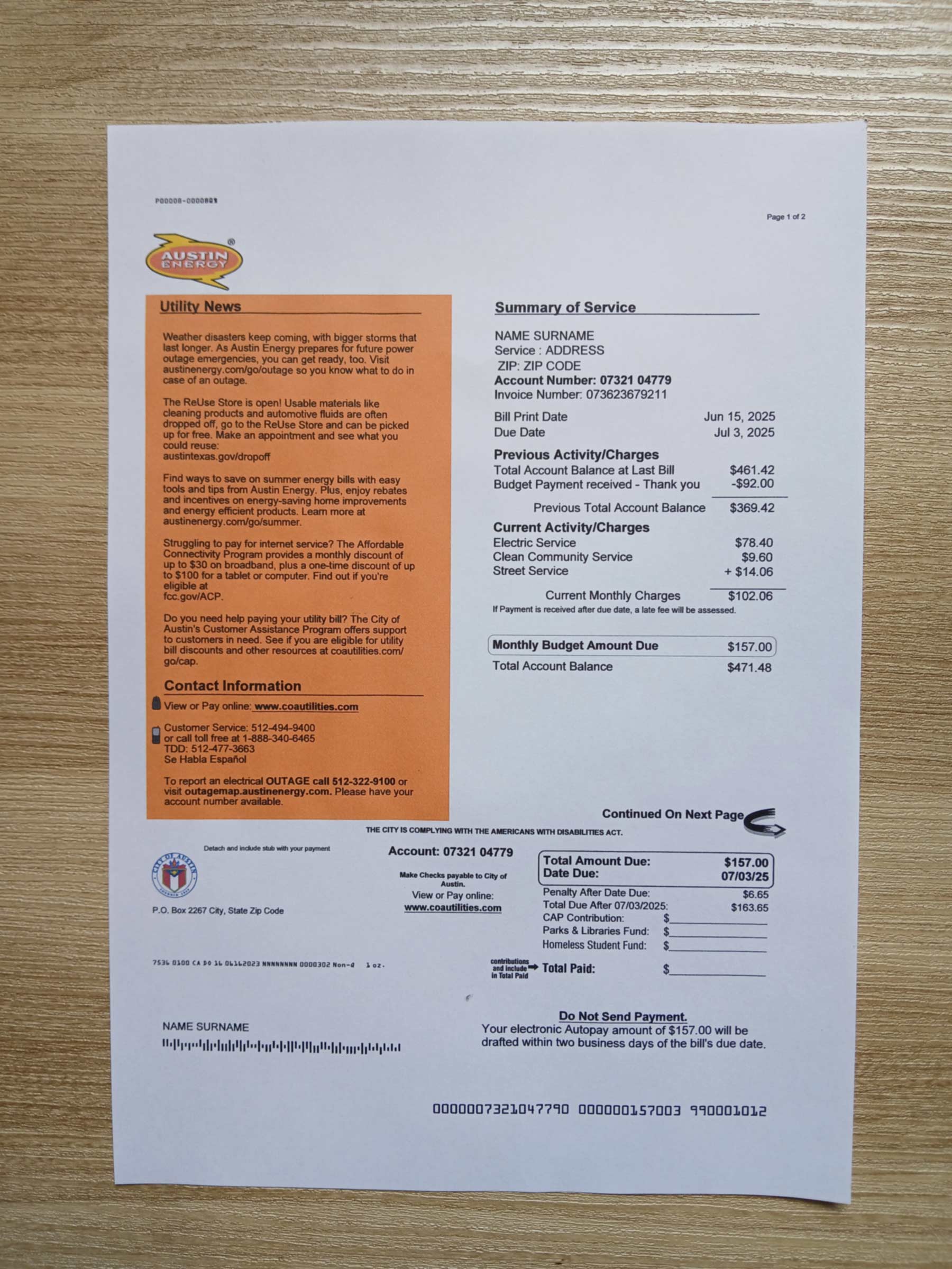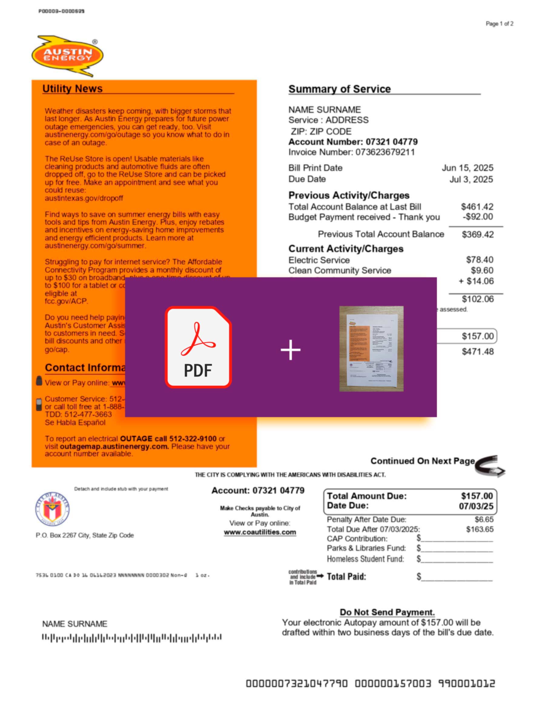 You can edit customer name, service location, account/reference numbers, statement/billing cycle dates, line items, and totals. We maintain Austin Energy–style layout conventions (sections, typography rhythm, and placement) so the statement remains clear, consistent, and easy to audit.