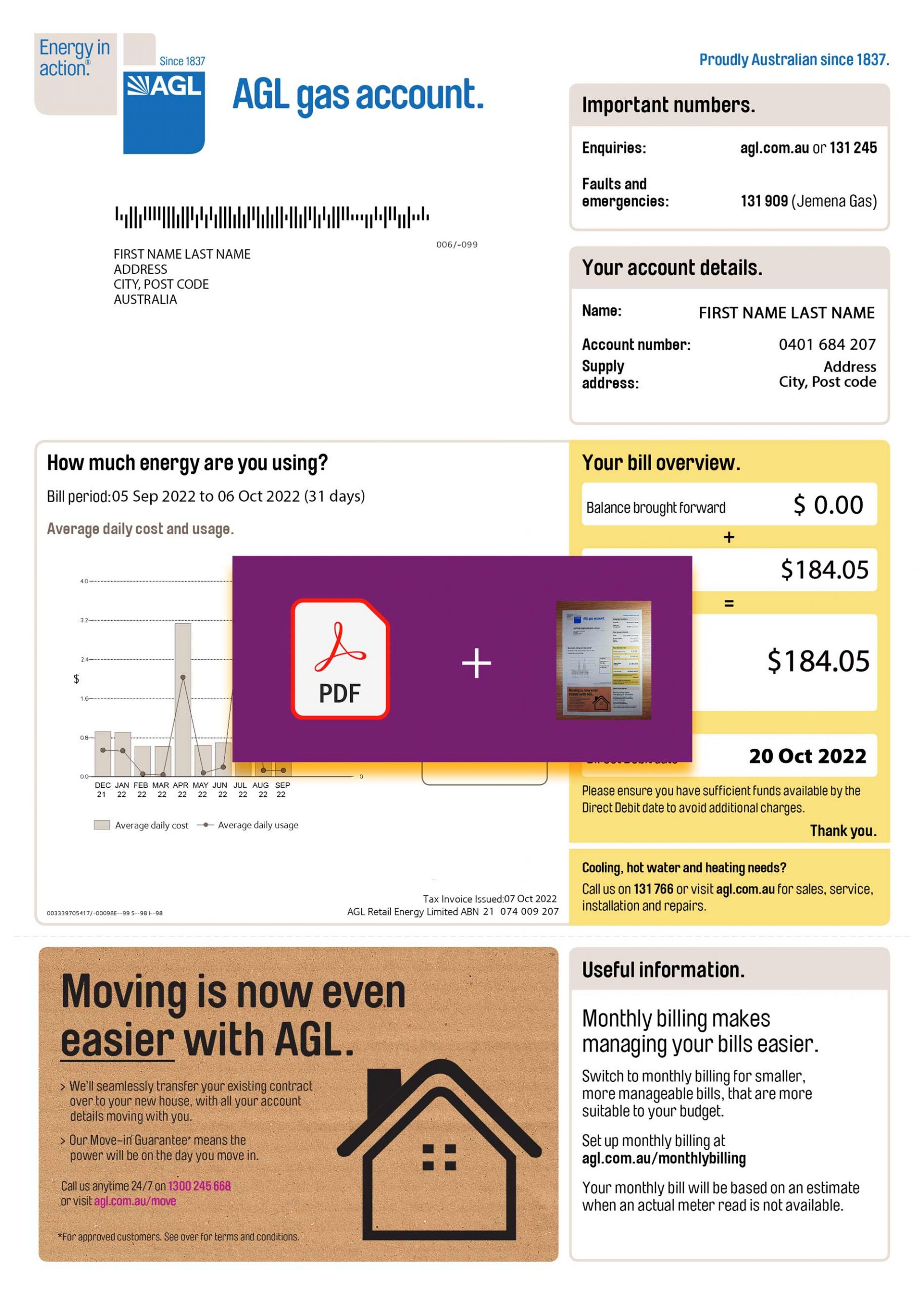 Editable elements include customer name, address, billing cycle, usage, and totals while preserving the authentic Origin Energy layout. Files are fully compatible with standard PDF editors and Adobe Photoshop, maintaining their 300 DPI structure and print-ready precision.