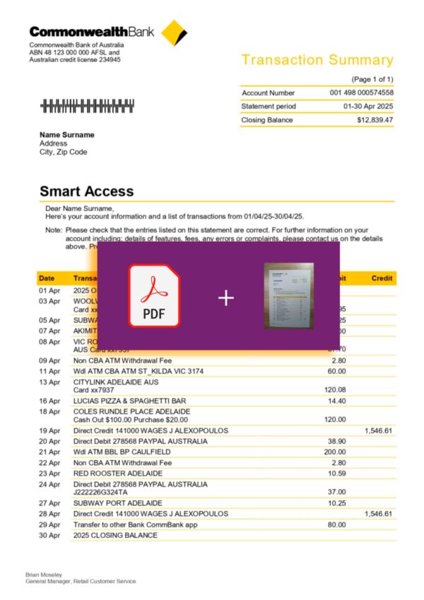 You’ll receive files in JPEG or PDF + JPEG formats, formatted to match the official Commonwealth Bank statement design. Editable sections include customer information, branch details, statement period, transaction history, and balance summaries. Each order comes with high-resolution output (300 DPI), free revisions until approved, a secure checkout experience, 24-hour turnaround, and continuous 24/7 support.