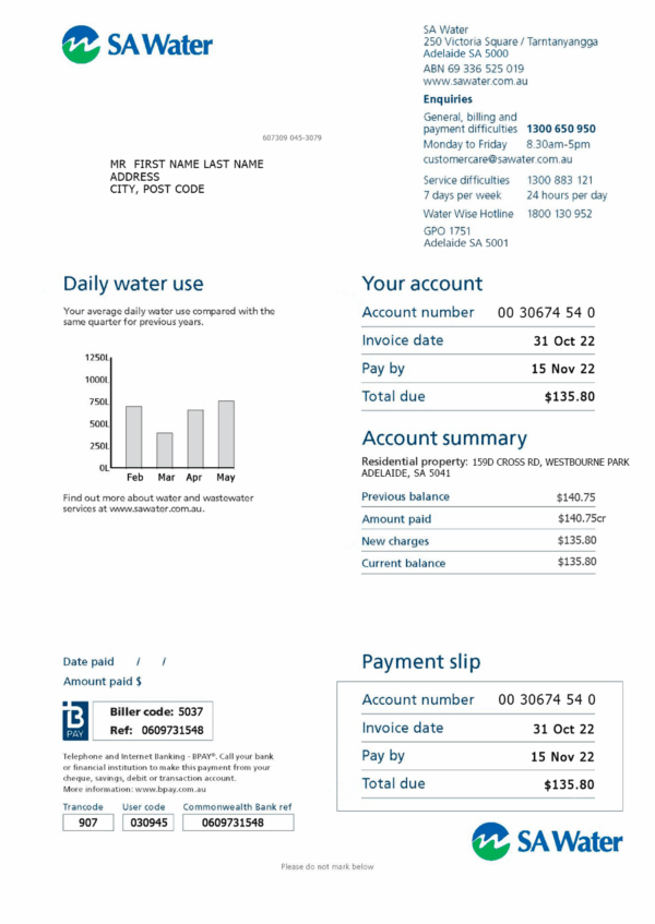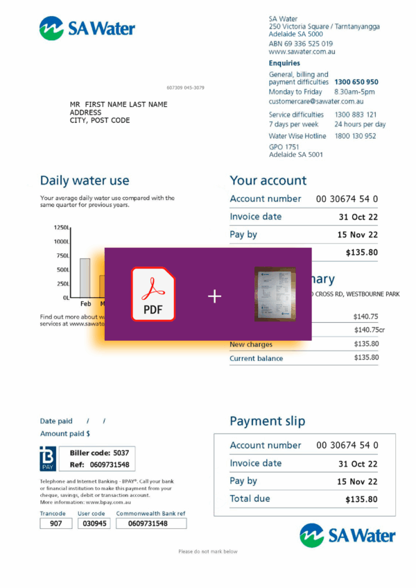 Each download includes both PDF and JPEG versions, formatted at 300 DPI for professional clarity. The structure aligns with SA Water’s official style, including editable sections for customer name, address, account number, billing cycle, usage readings, and total due. Every order comes with secure checkout, unlimited free revisions until approval, 24-hour turnaround, and 24/7 support for assistance or updates.