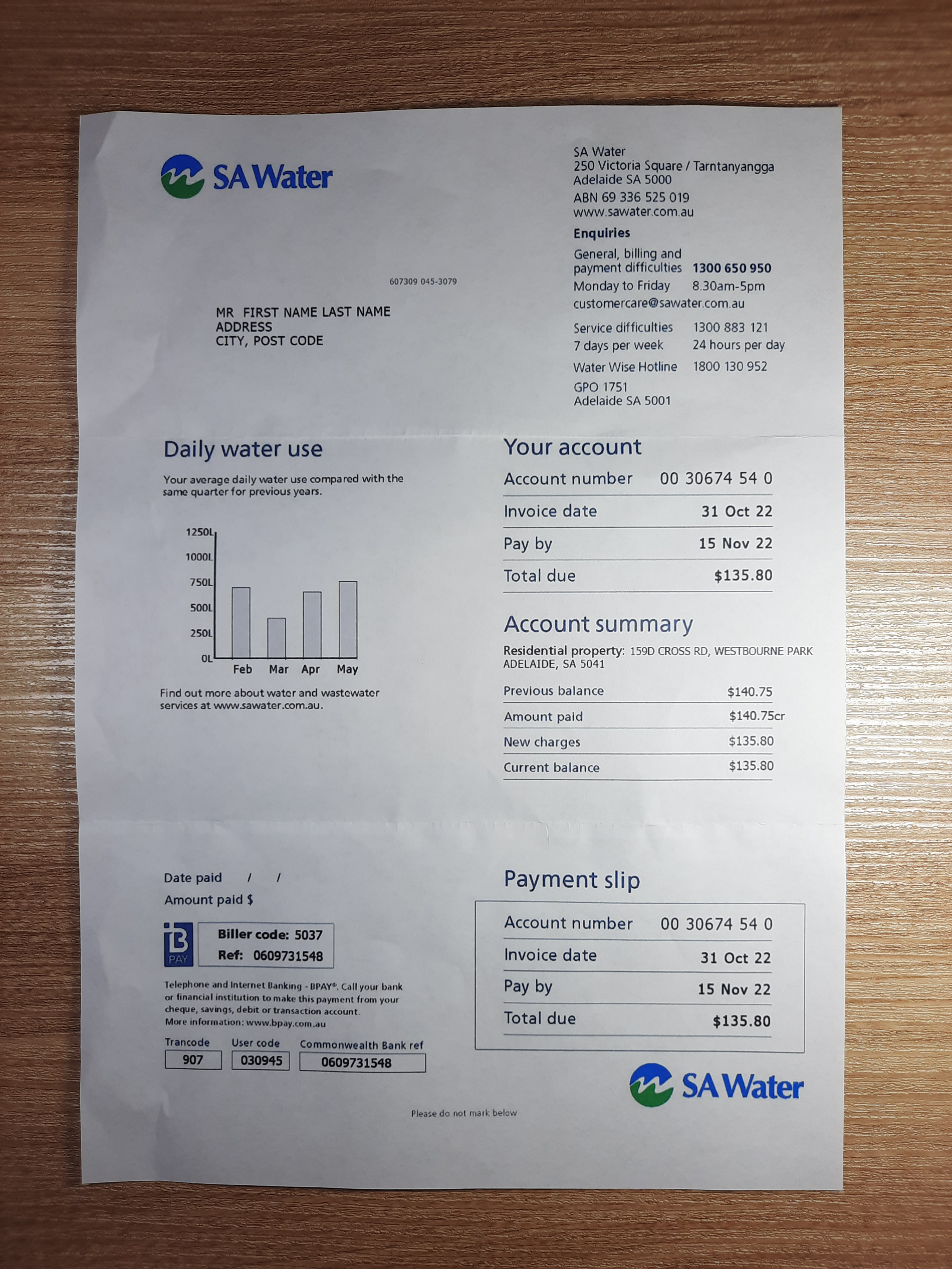 Editable elements include customer name, address, billing cycle, usage charges, and totals. The file retains SA Water’s recognizable layout and works with standard PDF editors or Adobe Photoshop while maintaining 300 DPI image integrity.