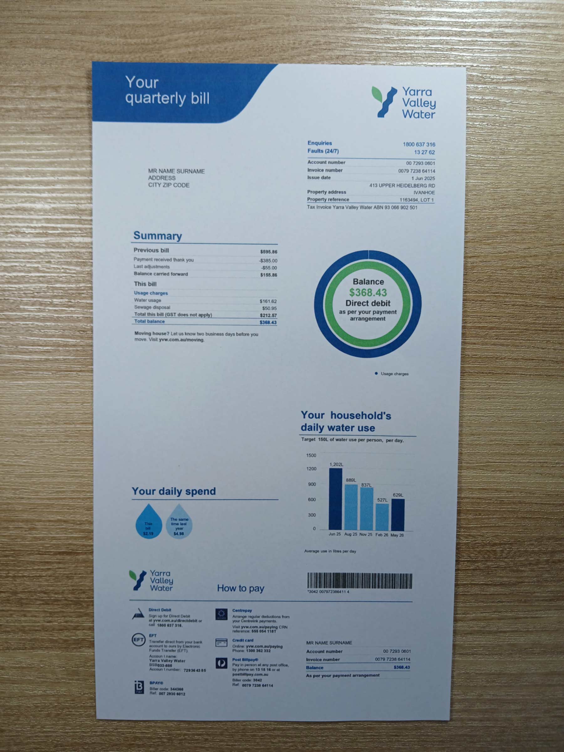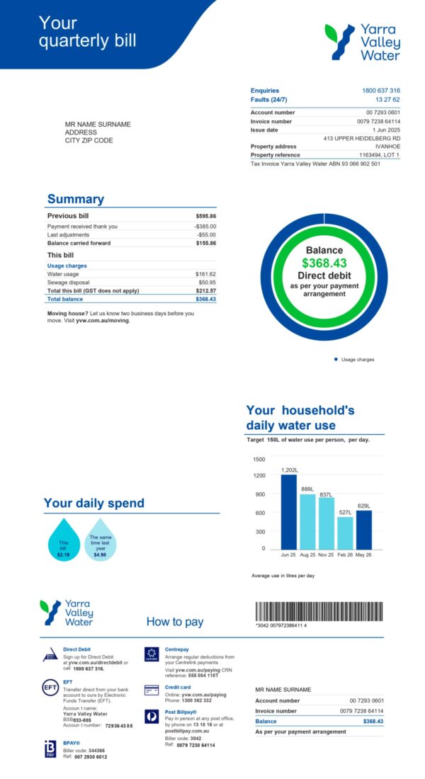 Editable fields include name, address, service account number, usage data, billing period, and totals. The file maintains the authentic Yarra Valley Water structure while remaining fully compatible with popular PDF editors and Photoshop for controlled customization.