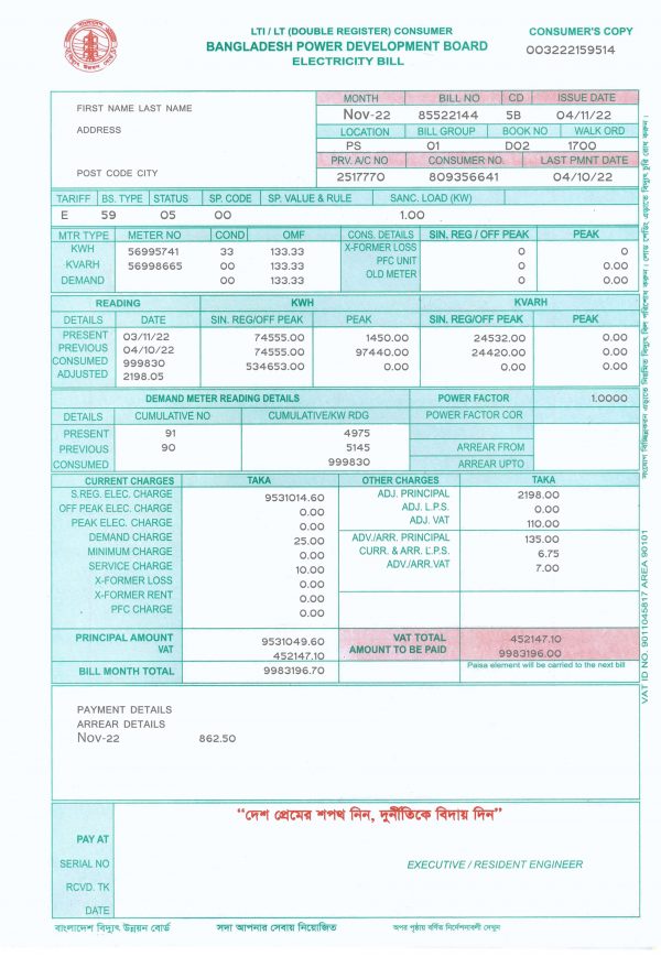 The Bangladesh Electricity Bill — Editable Utility Statement (300 DPI, 2025) is a professional, high-resolution file designed to replicate authentic Bangladeshi utility billing layouts. It’s ideal for UX designers, developers, and verification teams who need realistic visuals for POA/KYC documentation, testing workflows, or billing interface demos. Every section—account details, meter readings, billing cycle, and totals—is editable and formatted for accuracy. Our Done-For-You approach ensures you receive a ready-to-use, properly aligned layout without the need for manual editing.