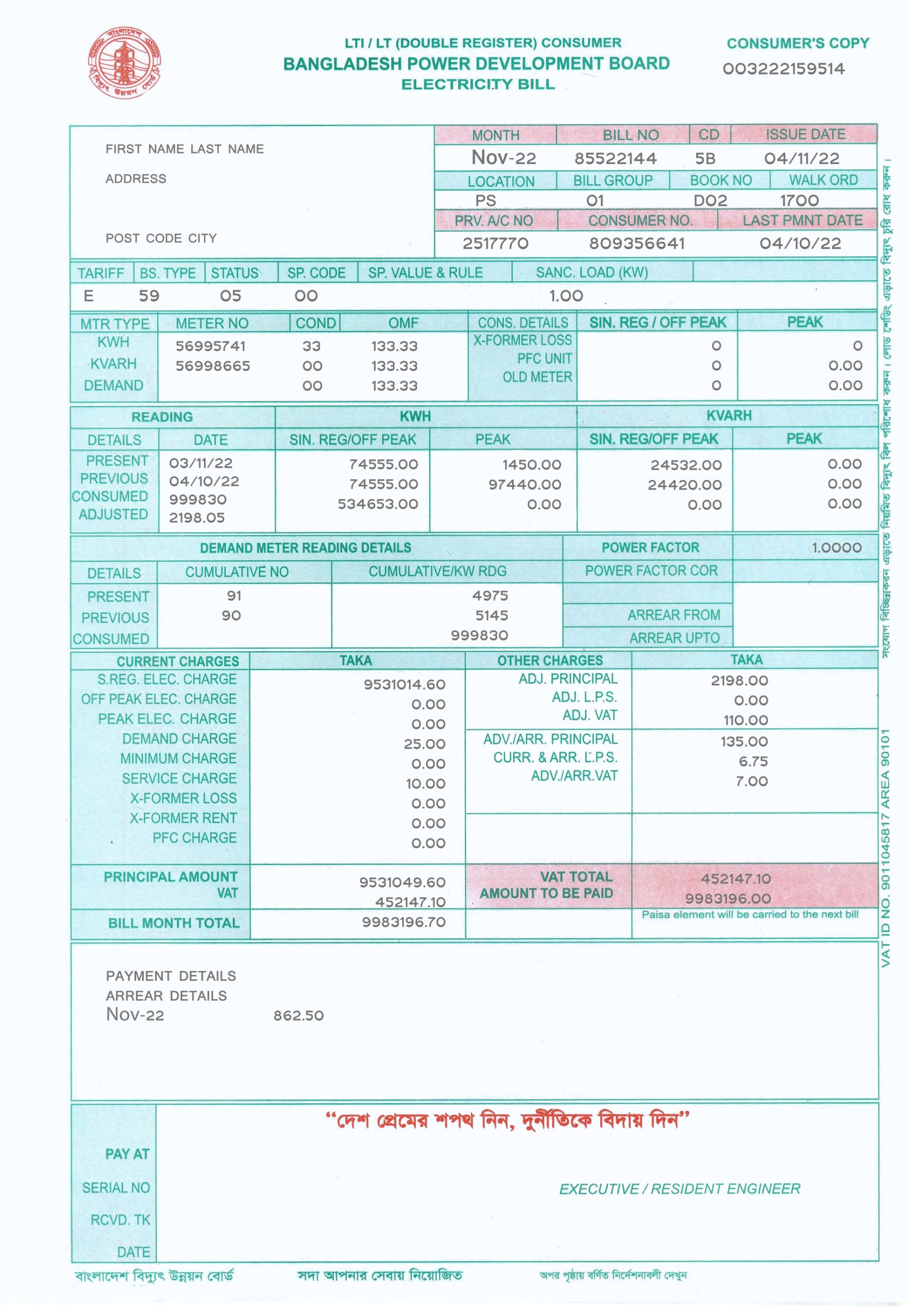 Editable components include customer name, service address, billing cycle, usage/charges, and totals. The layout reflects the authentic Bangladeshi electricity statement and works seamlessly with Adobe Photoshop or PDF editors while maintaining full 300 DPI quality for print or digital use.