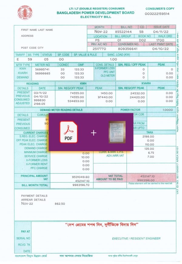 The Bangladesh Electricity Bill — Editable Utility Statement (300 DPI, 2025) is a professional, high-resolution file designed to replicate authentic Bangladeshi utility billing layouts. It’s ideal for UX designers, developers, and verification teams who need realistic visuals for POA/KYC documentation, testing workflows, or billing interface demos. Every section—account details, meter readings, billing cycle, and totals—is editable and formatted for accuracy. Our Done-For-You approach ensures you receive a ready-to-use, properly aligned layout without the need for manual editing.