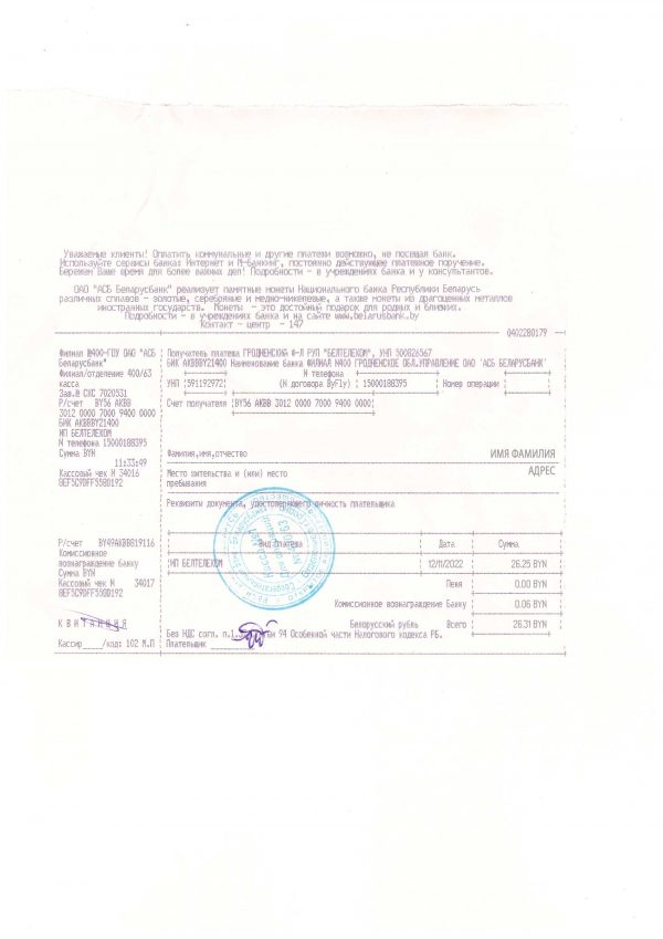 Your order includes both JPEG and PDF + JPEG versions in 300 DPI for sharp printing and on-screen clarity. The file layout is aligned with Belarusian utility billing formats and includes editable fields such as customer information, address, billing period, usage details, and total amounts. Free revisions are included until you approve the final version, along with a secure checkout process and 24/7 client support.