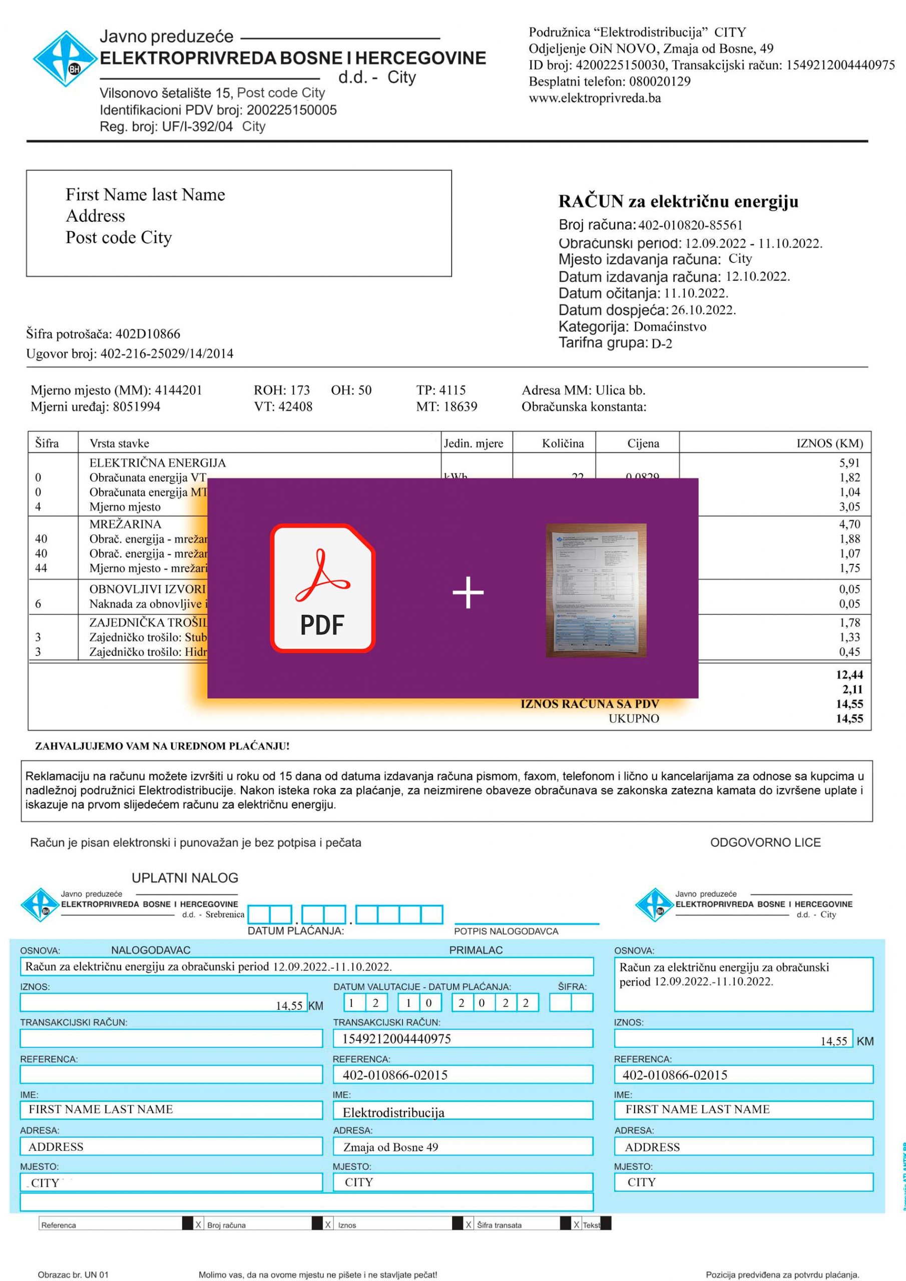 Your package includes JPEG or PDF + JPEG formats at full 300 DPI resolution. The layout aligns with authentic Bosnian electricity billing design. Editable sections include customer information, service address, billing period, meter readings, and total charges. Each order includes free revisions until approved, fast 24-hour turnaround, secure payment, and 24/7 customer support.