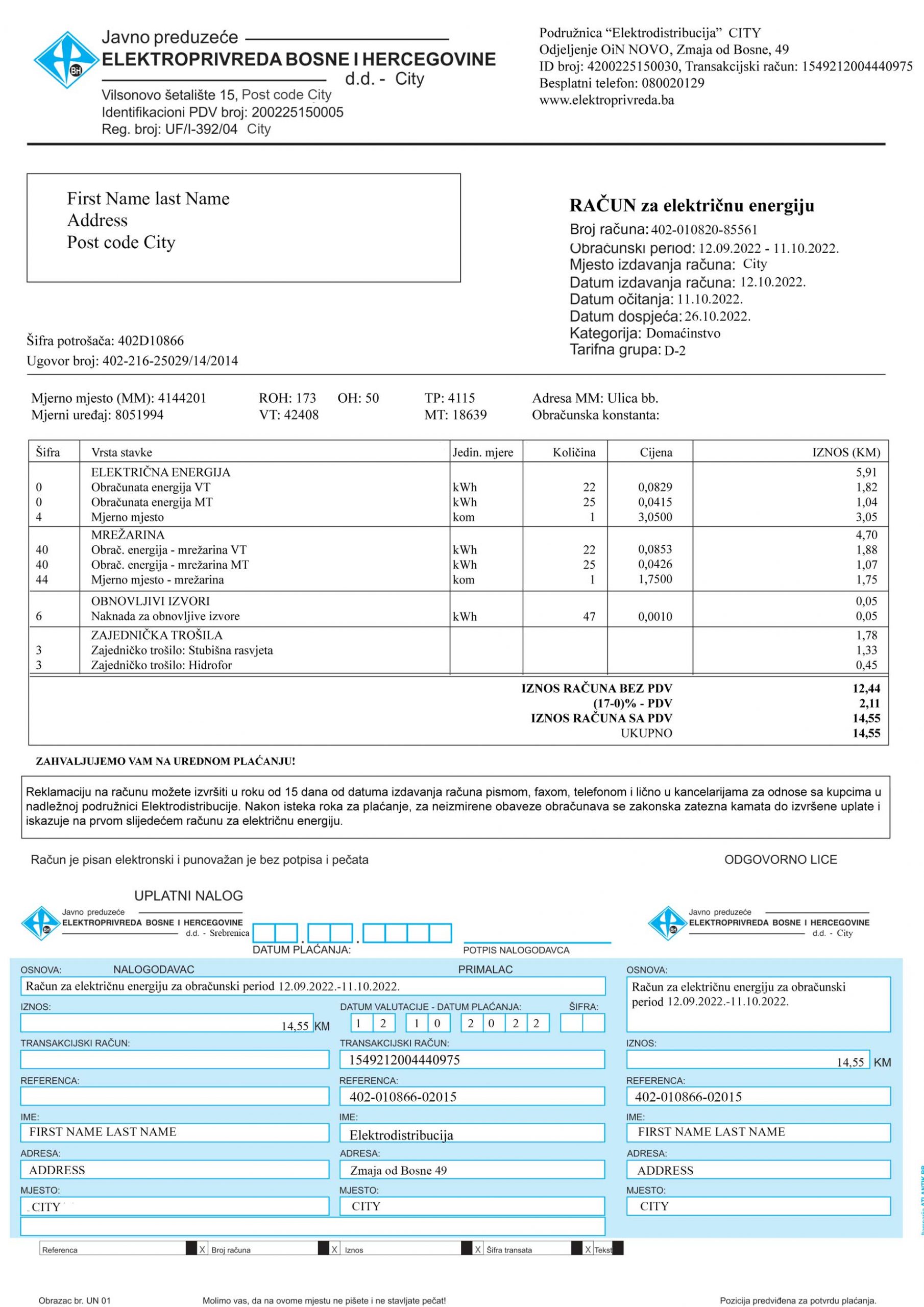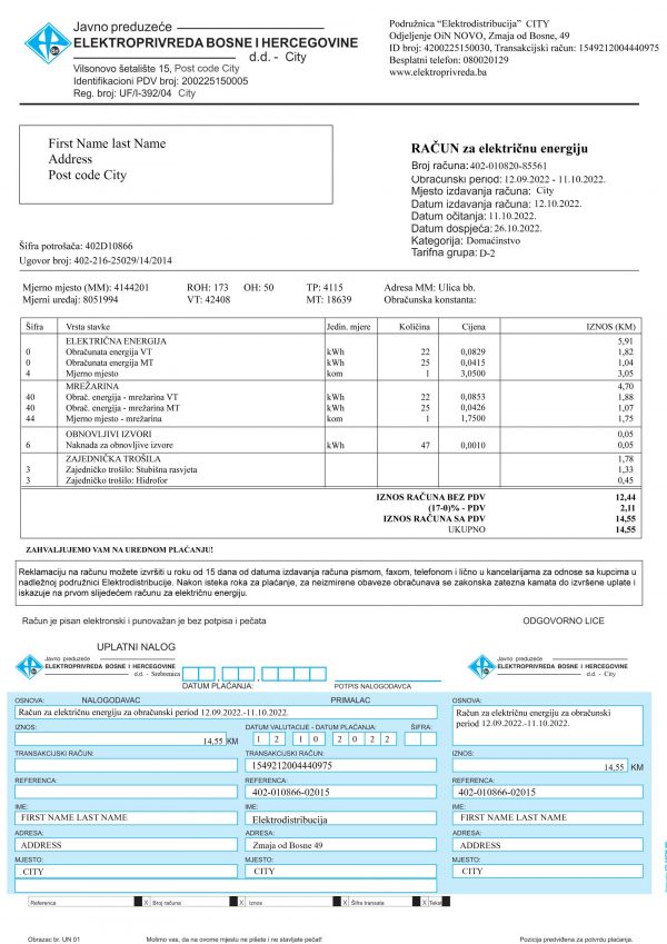 This editable Bosnia electric bill statement replicates the country’s standard utility billing layout, featuring realistic sections for usage, meter readings, and totals. Designed in 300 DPI, it’s suitable for professionals needing visual documentation for POA/KYC verification, UX testing, or interface simulation. All data fields, including customer name, address, billing cycle, and totals, can be customized through our Done-For-You process — no manual editing required.