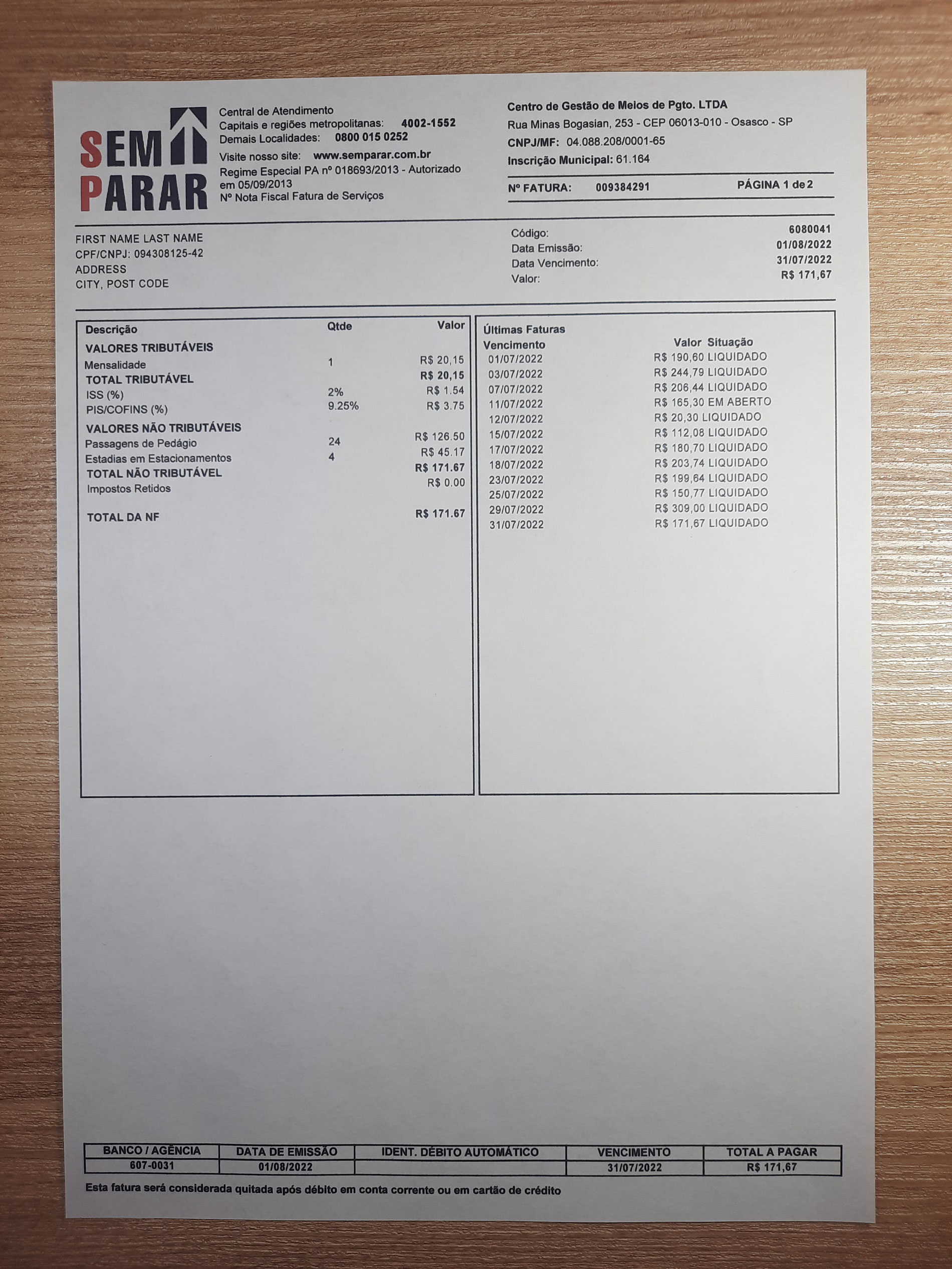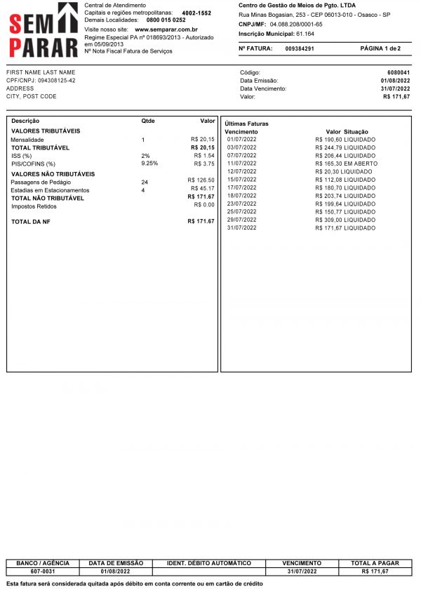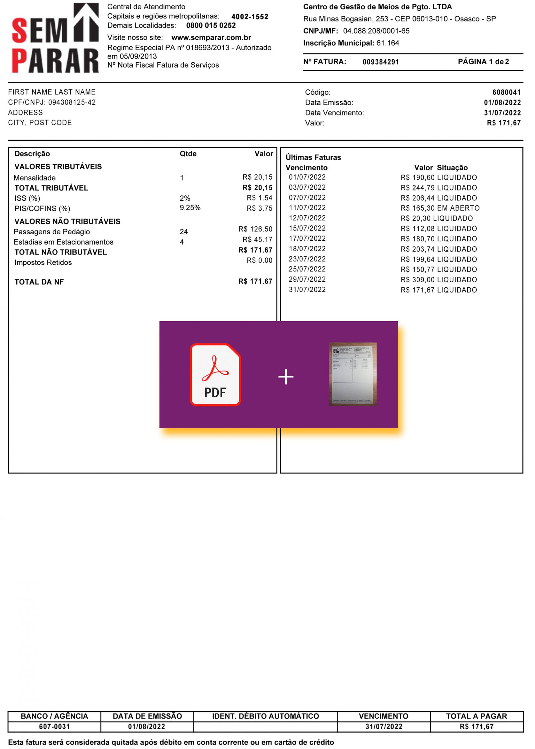 Editable sections include customer name, address, usage details, billing cycle, and payment totals. The design stays true to the Sem Parar structure and works with standard PDF editors and Adobe Photoshop while maintaining full 300 DPI resolution.