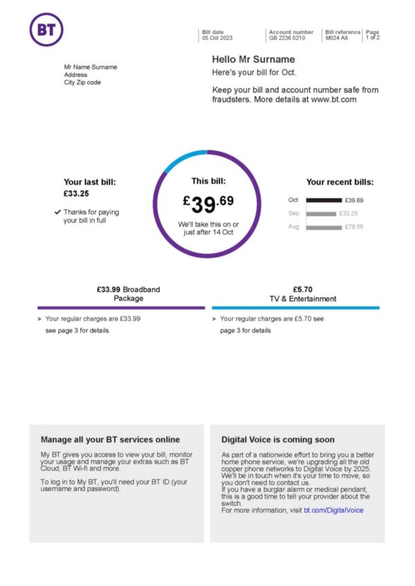 This editable BT TV bill is provided for ethical use only, such as UI/UX simulations, platform demos, lawful verification, or internal documentation reviews. Always ensure compliance with data protection and platform policies.