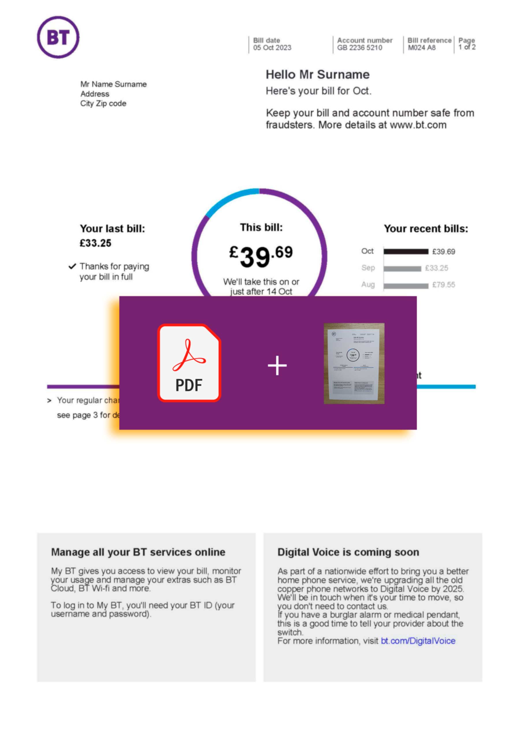 The BT TV utility bill pairs well with the UK TV Licence example and Tesco Mobile layout, both great for realistic telecom-style document mockups and professional proof-of-address simulations.