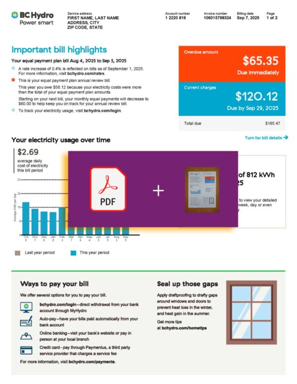Your download includes PDF + JPEG formats in 300 DPI resolution. The file follows BC Hydro’s official layout and contains editable fields for name, address, account number, meter readings, billing period, and totals. The package includes free revisions until approved, secure checkout, delivery within 24 hours, and continuous customer support to guarantee satisfaction.