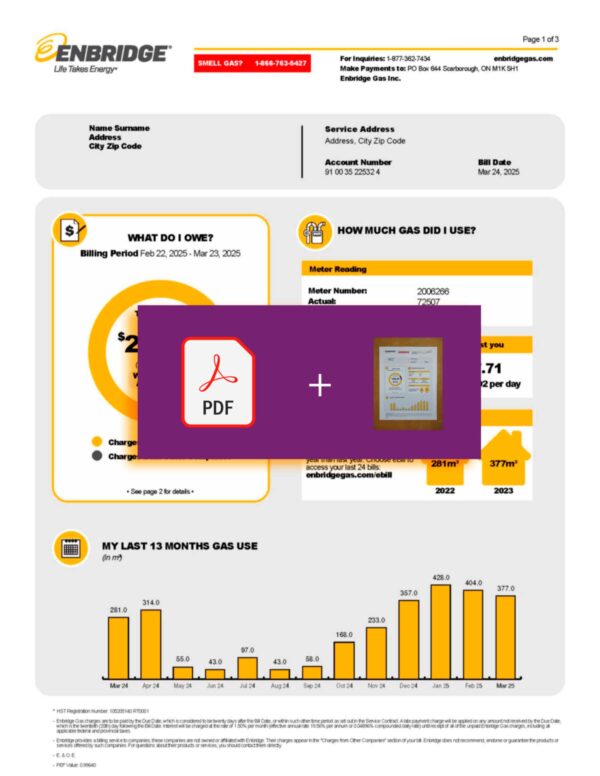Your download includes JPEG or PDF + JPEG versions in 300 DPI, fully aligned with the authentic Enbridge layout for Ontario residents. Editable fields cover customer name, address, account number, billing cycle, and totals. The package provides free revisions until approval, 24-hour turnaround, secure checkout, and full customer support available at any time.