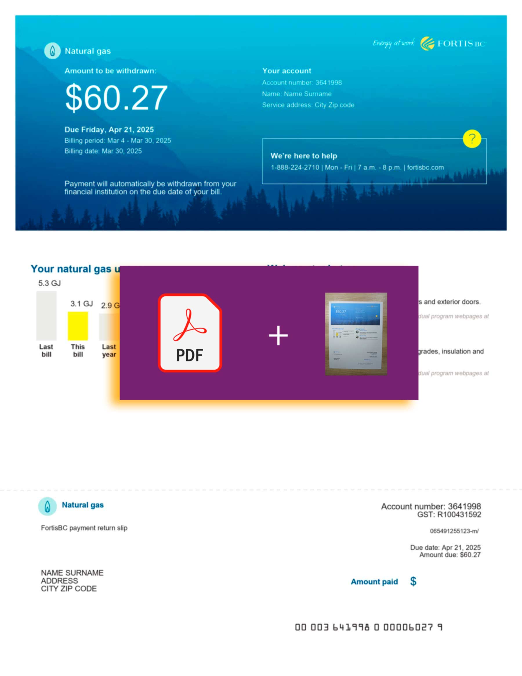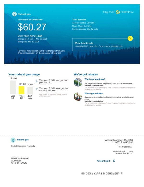 This editable Fortis BC gas utility bill template for British Columbia (2025) provides a high-resolution, professionally designed layout ideal for UX demos, address verification workflows, and compliance simulations. Built at 300 DPI, it captures the authentic design structure of Fortis BC statements while allowing users to customize key details such as name, address, billing period, and total charges. Perfect for developers, operations teams, and designers needing realistic proof-of-address visuals or KYC-ready document simulations.