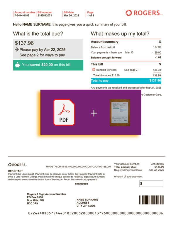You’ll receive JPEG or PDF + JPEG formats at 300 DPI. The file follows the official Rogers Canada mobile bill layout, including editable areas for customer name, address, plan details, billing cycle, and payment totals. Your package includes free revisions until approval, delivery within 24 hours, secure checkout, and 24/7 customer assistance for complete peace of mind.