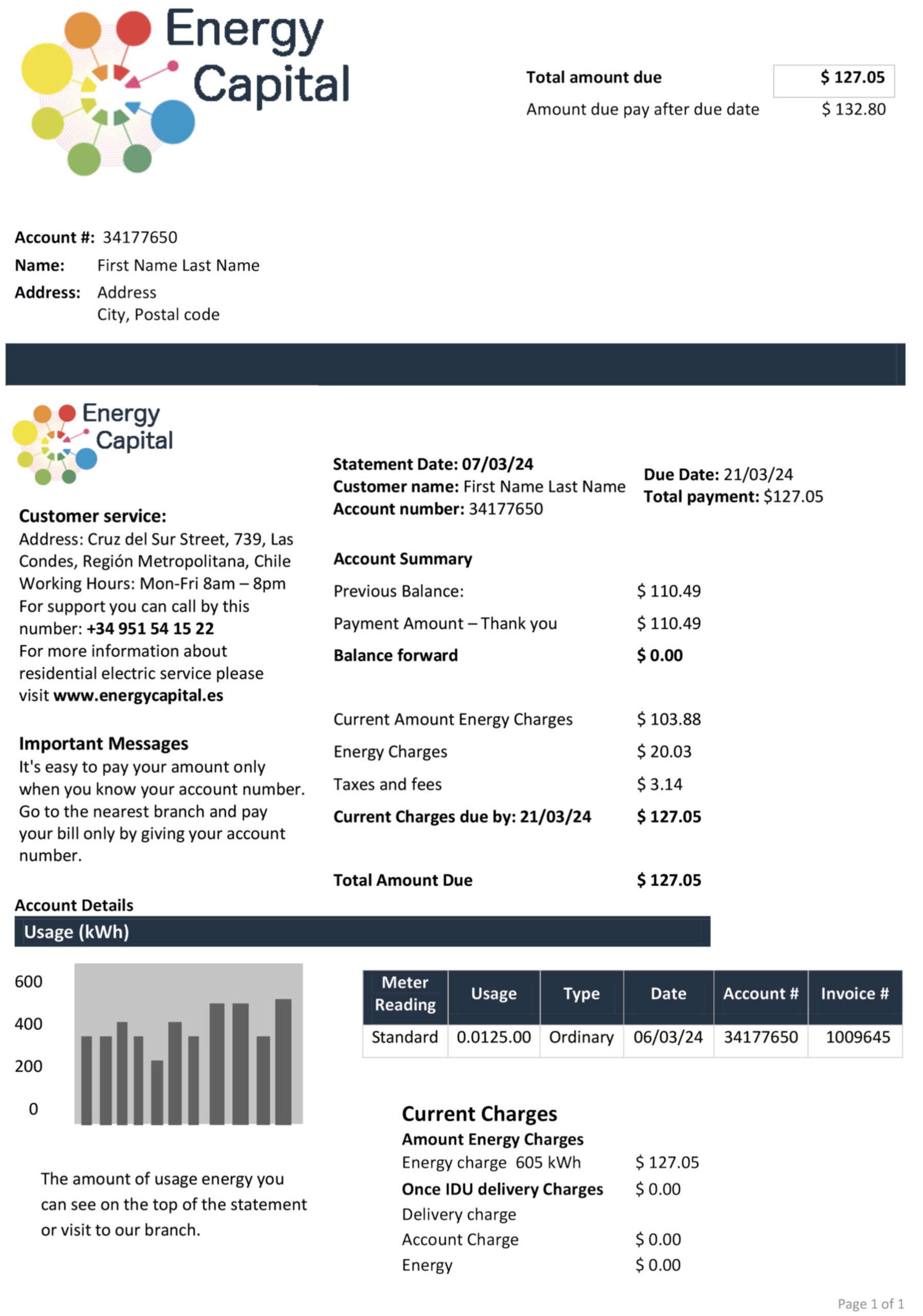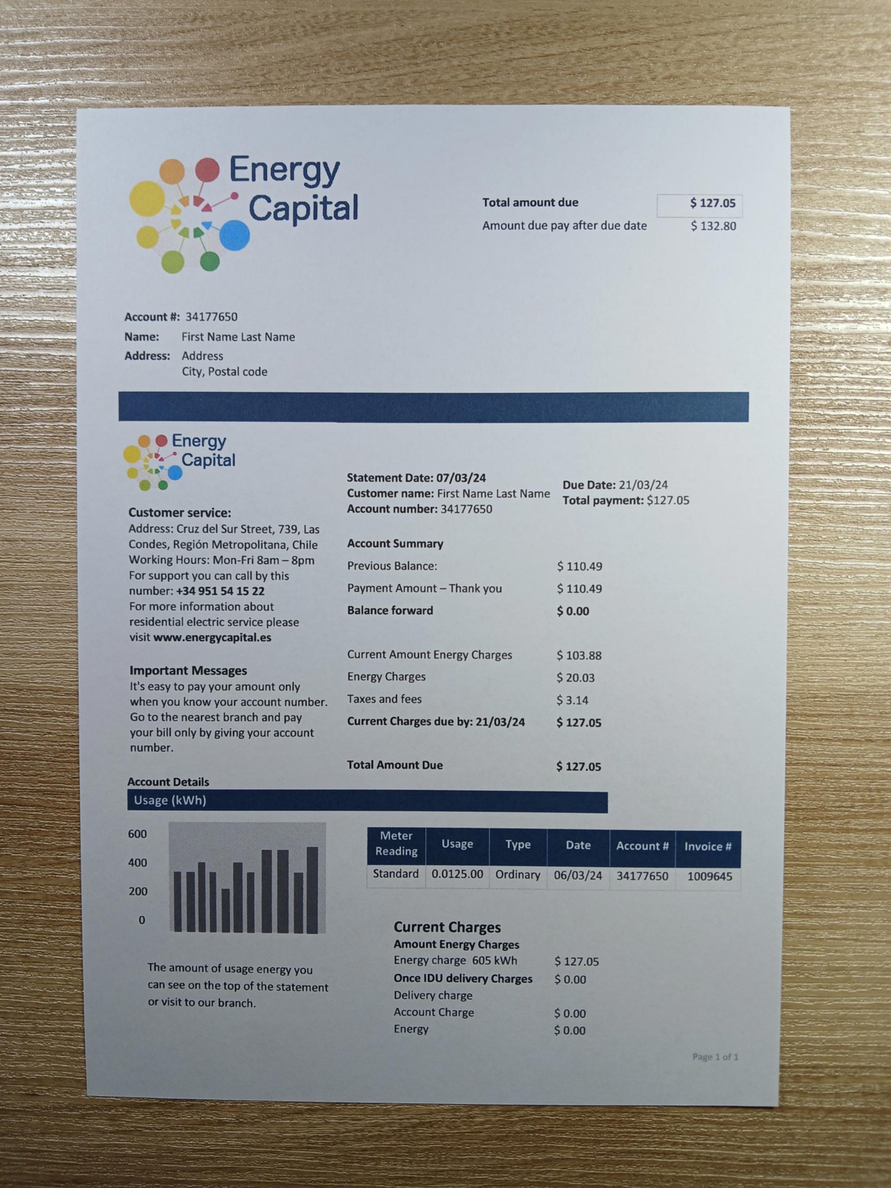 Your download includes JPEG or PDF + JPEG formats at 300 DPI. The Chile layout includes editable fields such as customer name, address, service date, usage, and amount due. Every order comes with free revisions until approval, fast turnaround, secure payment, and 24/7 customer assistance. The design follows the recognizable structure of Chilean utility statements, ready for documentation and KYC/POA tasks.