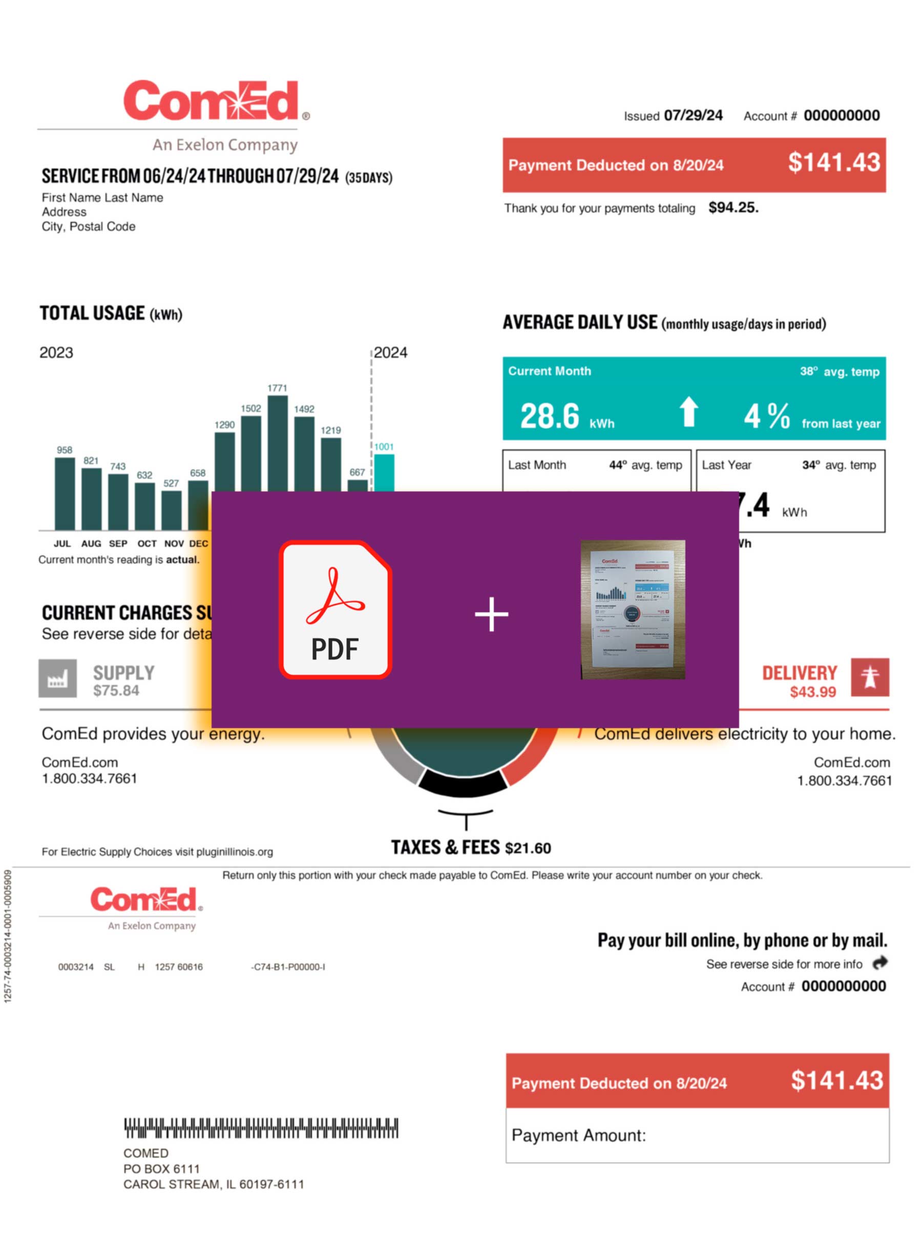 Each order includes both JPEG and PDF versions of the ComEd electric bill, formatted for print or digital presentation. Editable sections cover the customer’s name, address, service dates, billing cycle, and total charges. Every file is optimized for 300 DPI resolution and comes with secure checkout, 24-hour turnaround, free revisions until approved, and round-the-clock support from our team.