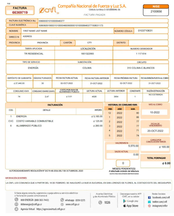 The Costa Rica Electricity Bill — CNFL Statement (Editable, 2025) provides a professional, editable layout of a modern CNFL power bill in high-resolution 300 DPI. Created for designers, developers, and compliance teams, it allows full customization of customer information, usage data, and totals while preserving the authentic Costa Rican format. This Done-For-You file is ideal for POA/KYC simulations, UX testing, and digital verification visuals where accuracy and clarity matter.