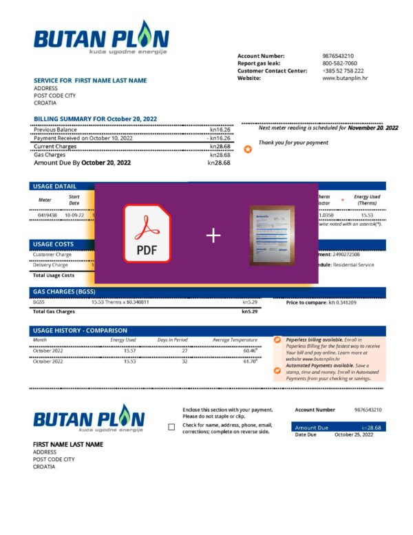 Your order includes JPEG or PDF + JPEG formats with full 300 DPI clarity. The PLIN bill layout is structured according to Croatian standards and offers editable fields such as customer name, address, billing cycle, and gas usage totals. All purchases include free revisions until approval, guaranteed 24-hour turnaround, secure checkout, and continuous customer support.