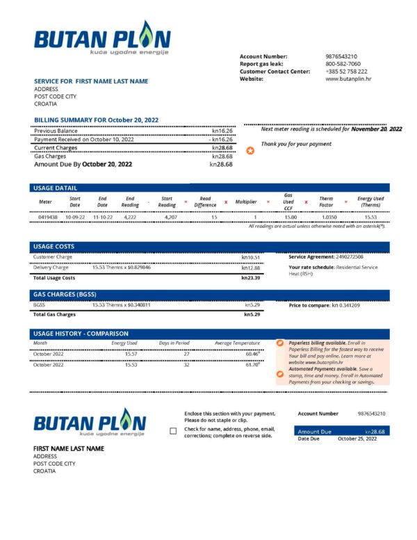 This editable Croatia gas statement is provided for lawful and compliant purposes — such as UX/UI visual testing, documentation demos, or proof-of-address (POA) verification simulations. Always use ethically and within platform guidelines.