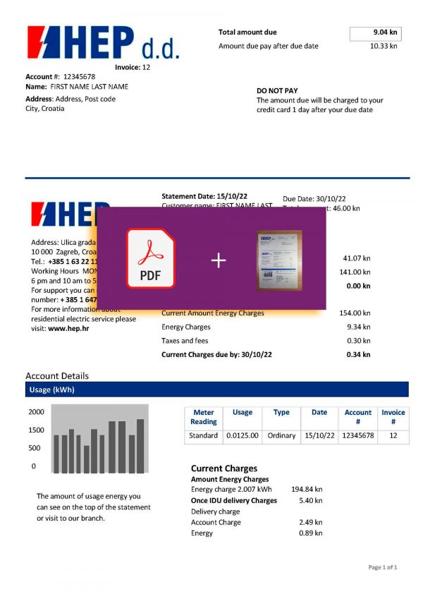 Your download includes JPEG or PDF + JPEG versions of the HEP electricity statement. The file mirrors Croatia’s official billing format, with editable text layers for customer name, service address, usage details, and billing totals. You’ll receive free revisions until approved, fast delivery within 24 hours, and a secure checkout experience backed by 24/7 customer support.