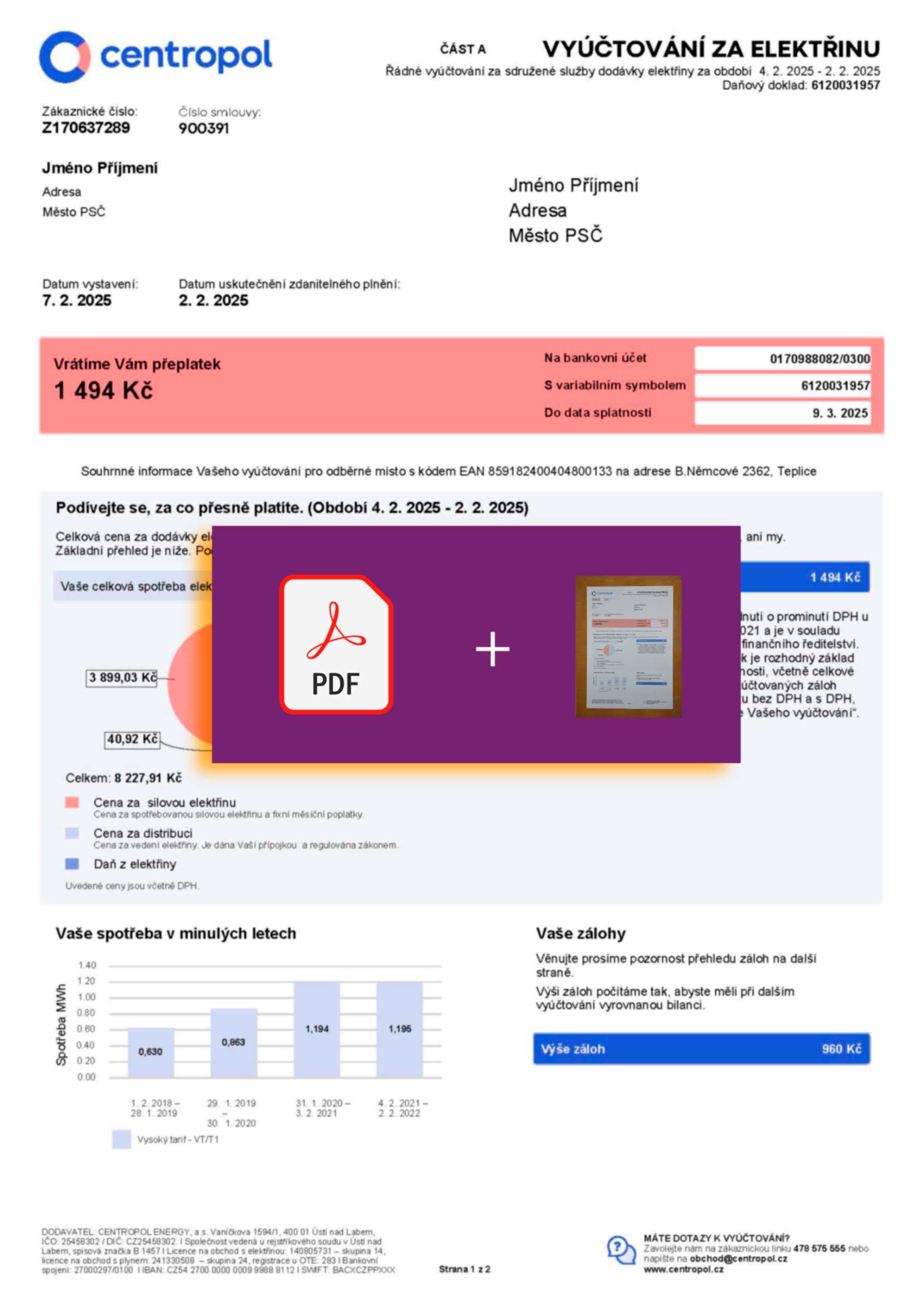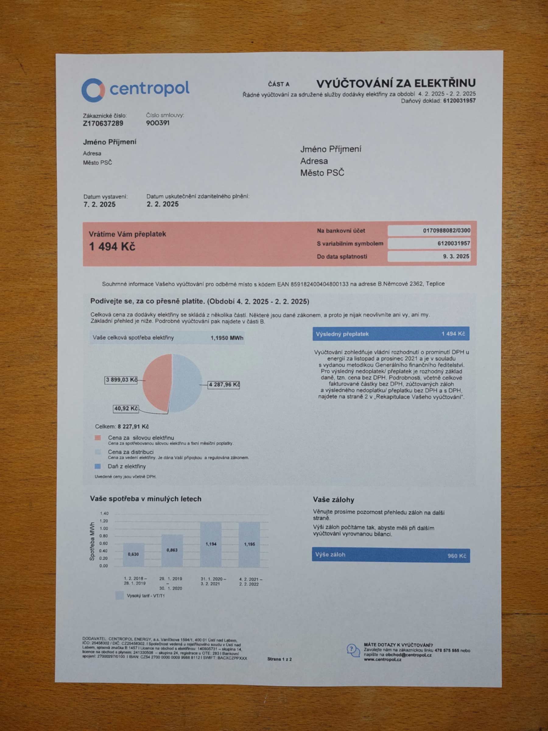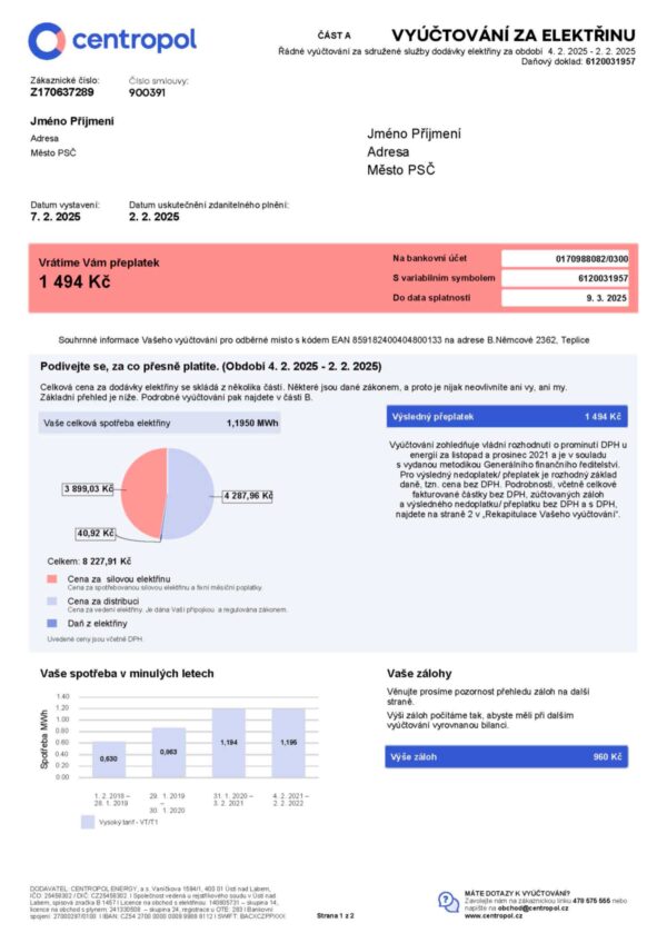 The Centropol electricity layout offers crisp typography and editable fields for professional mockups and KYC demos. Also check out the Czech national electricity template and the E.ON Czech format to compare regional styling and realism.
