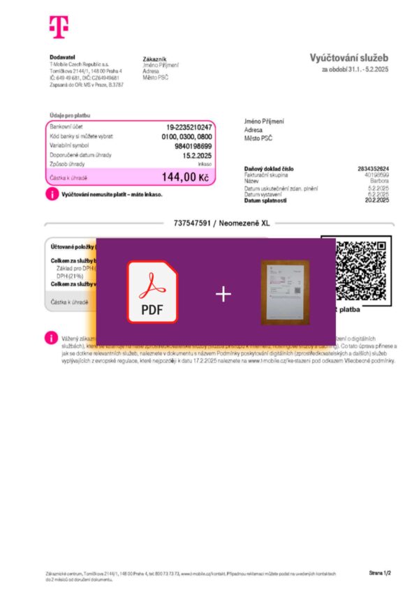 You receive high-resolution PDF + JPEG files, built in 300 DPI for clarity and print-ready detail. The layout aligns with T-Mobile’s Czech Republic phone bill format. Editable sections include customer name, address, billing period, plan charges, and totals. Package includes free revisions until approved, guaranteed 24-hour turnaround, secure checkout, and 24/7 customer support for your peace of mind.