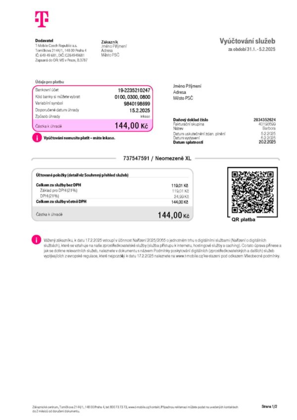 The T-Mobile Czech bill sample focuses on clarity and editable fields, great for UX testing and proof-of-address bundles. Discover how it matches the Vodafone phone layout and the Czech electricity template for consistent styling across mockups.