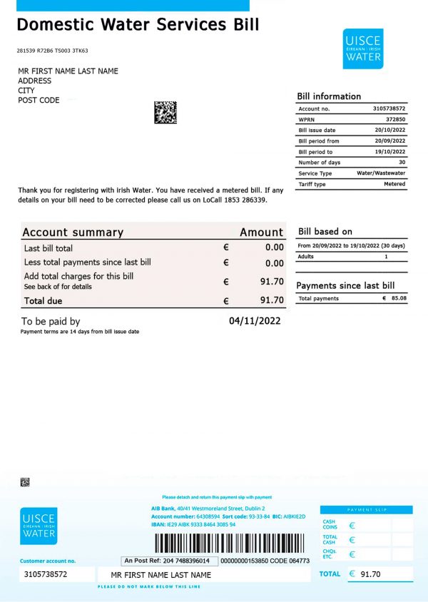 This Domestic Water Ireland bill matches well with the Meteor Ireland design and Electric Ireland statement, both ideal for editable document sets and UX-focused projects.