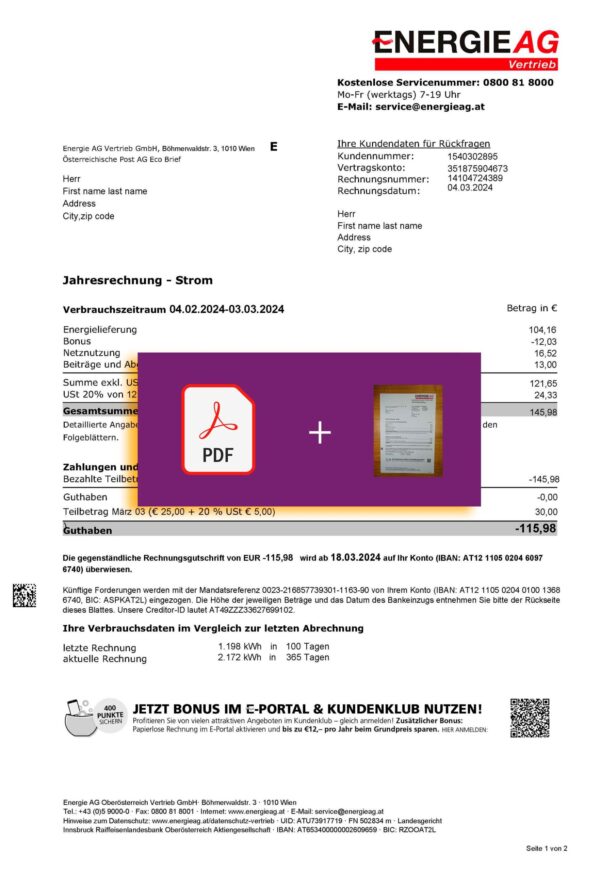 This package includes JPEG or PDF + JPEG formats, formatted at 300 DPI for print and digital clarity. It follows the Energie AG Austria layout and includes editable sections for customer name, service address, billing period, energy consumption data, and total charges. You’ll also receive free revisions until approval, secure payment processing, and guaranteed 24-hour turnaround with full customer support available 24/7.
