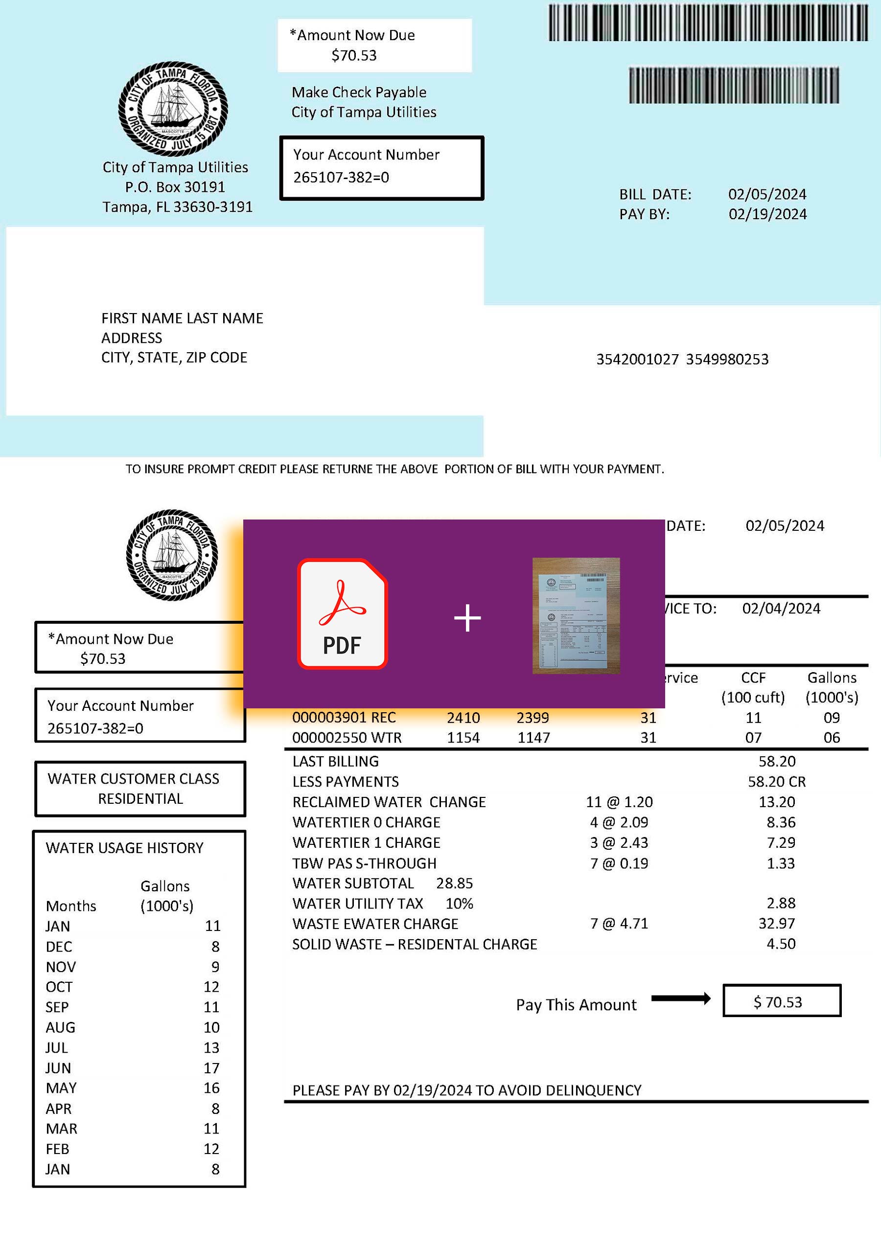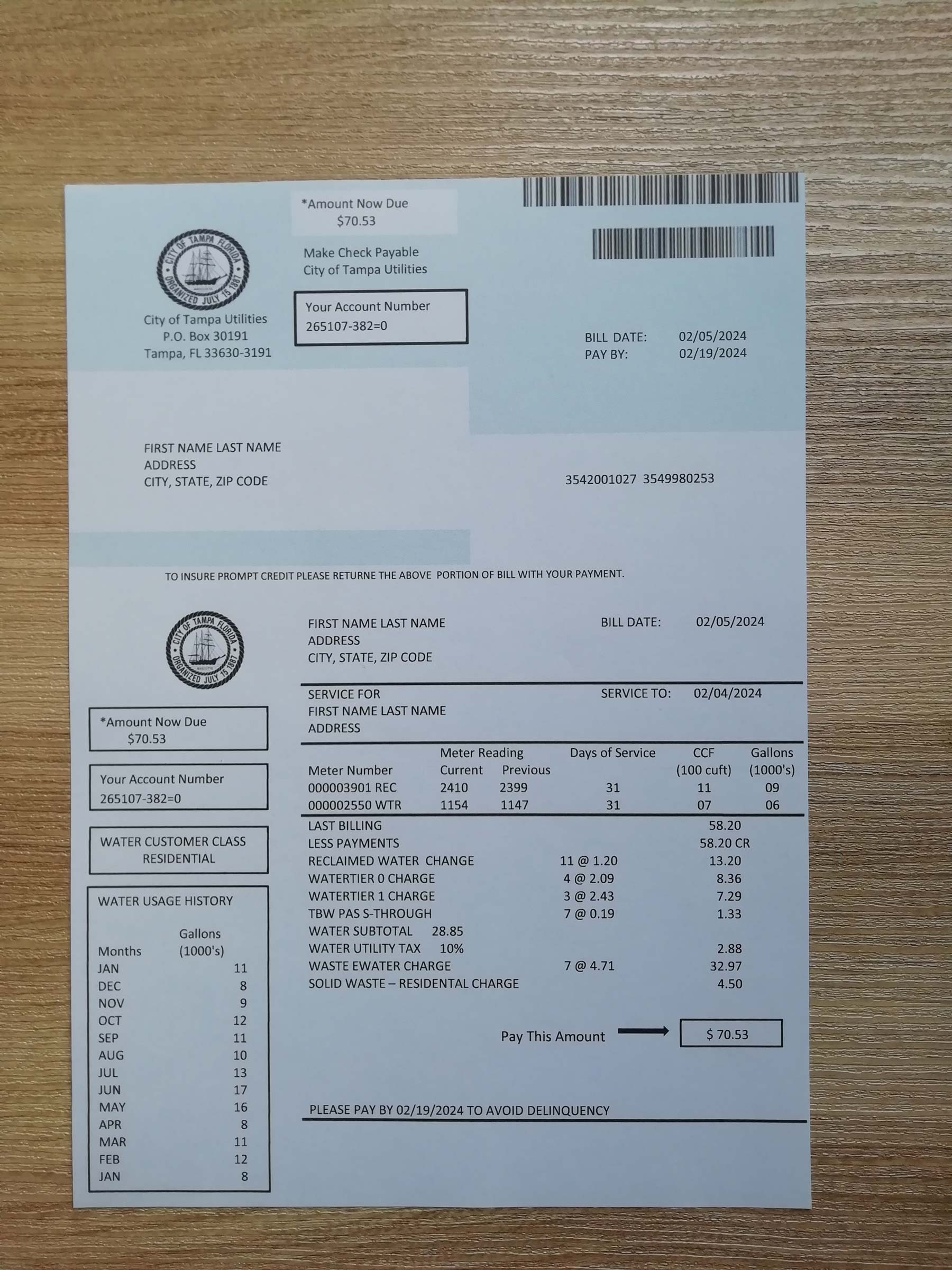 The Generic Florida Water Utility Bill Template (2025 Editable Format) provides a realistic, high-resolution (300 DPI) document designed to replicate standard water billing layouts used across Florida. It’s an editable file suitable for professional applications such as POA/KYC verification demos, interface testing, and document presentation workflows. With a Done-For-You process, all customization — from billing cycle details to totals — is handled by our in-house team, ensuring precision and compliance-ready formatting for designers, developers, and verification teams.
