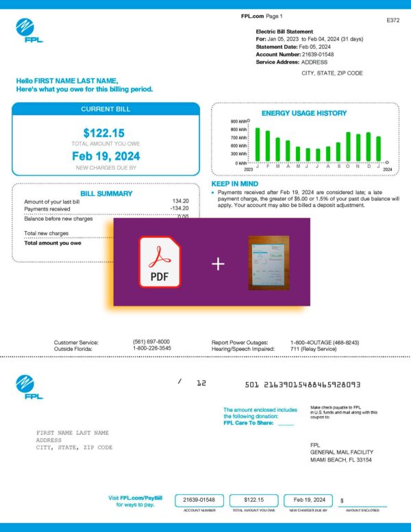 Download includes: JPEG or PDF + JPEG formats. The template preserves FPL’s clean, data-driven structure with editable fields for customer name, service address, billing period, energy usage, and total amount due. Files are produced at 300 DPI for professional visual fidelity, with secure checkout, free revisions until approved, 24-hour turnaround, and full-time customer support.
