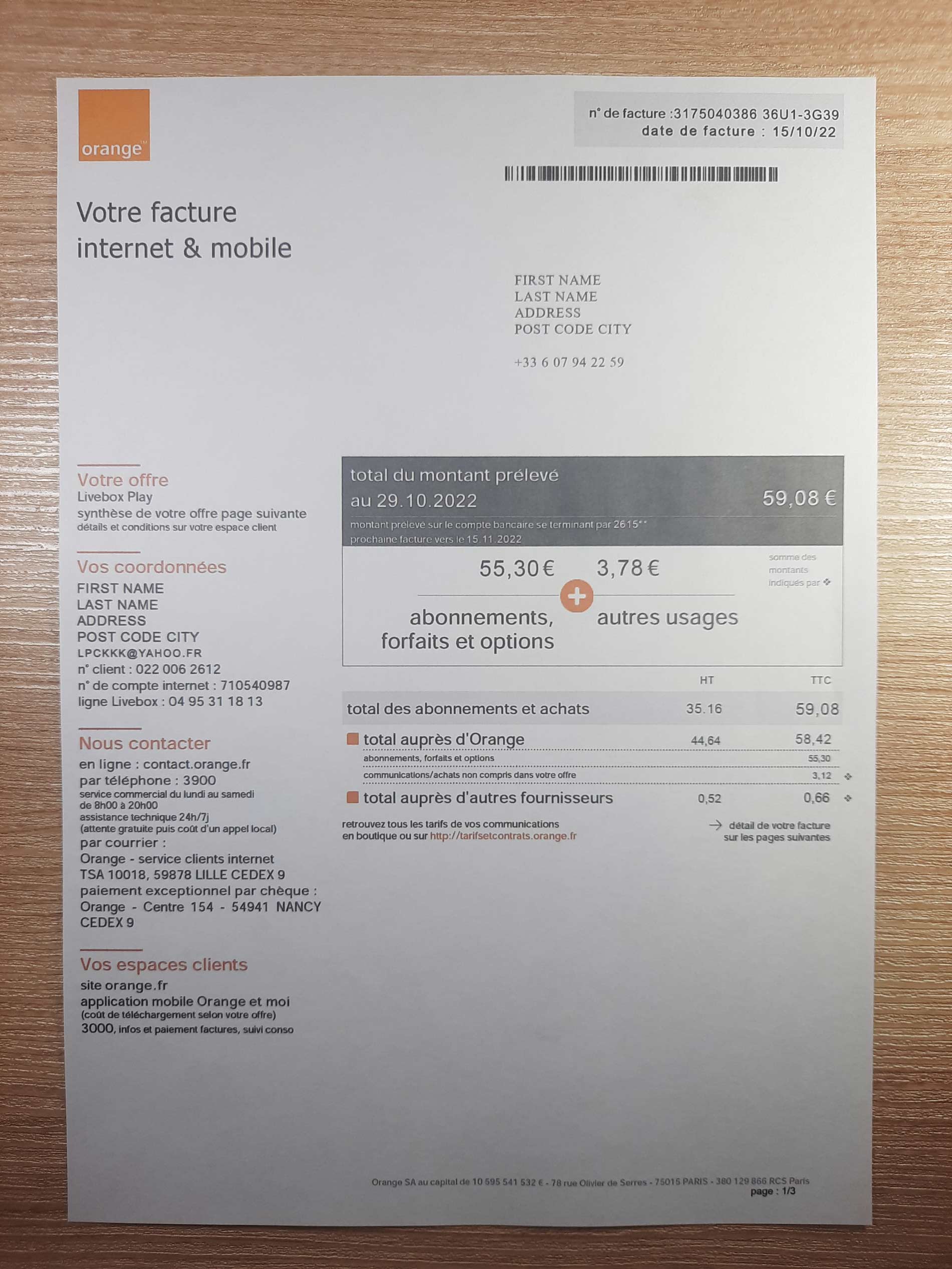 Just relocated to France and your phone contract is set up, but a paper statement in your name hasn’t arrived yet and address verification is already on your to-do list. The team prepares a French phone bill in your name and sends it straight to your email as a JPEG or PDF+JPEG. Fast and simple — delivered within 24 hours, frequently the same day.