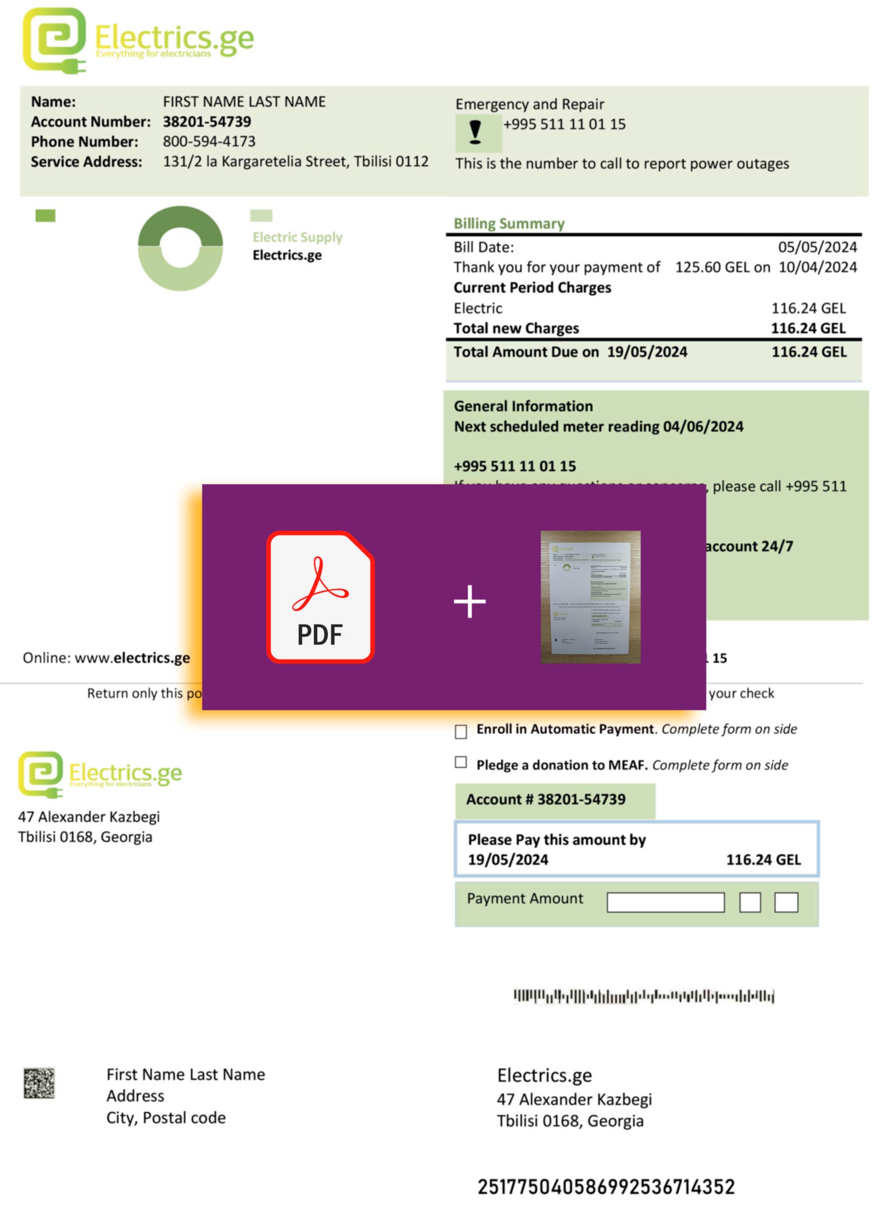 Your download includes JPEG and PDF versions at full 300 DPI clarity. The layout is aligned with standard Georgian electricity billing formats and comes with editable fields for customer name, address, billing cycle, usage data, and payment totals. Enjoy free revisions until approval, secure checkout, 24-hour delivery, and responsive support to ensure seamless customization from start to finish.