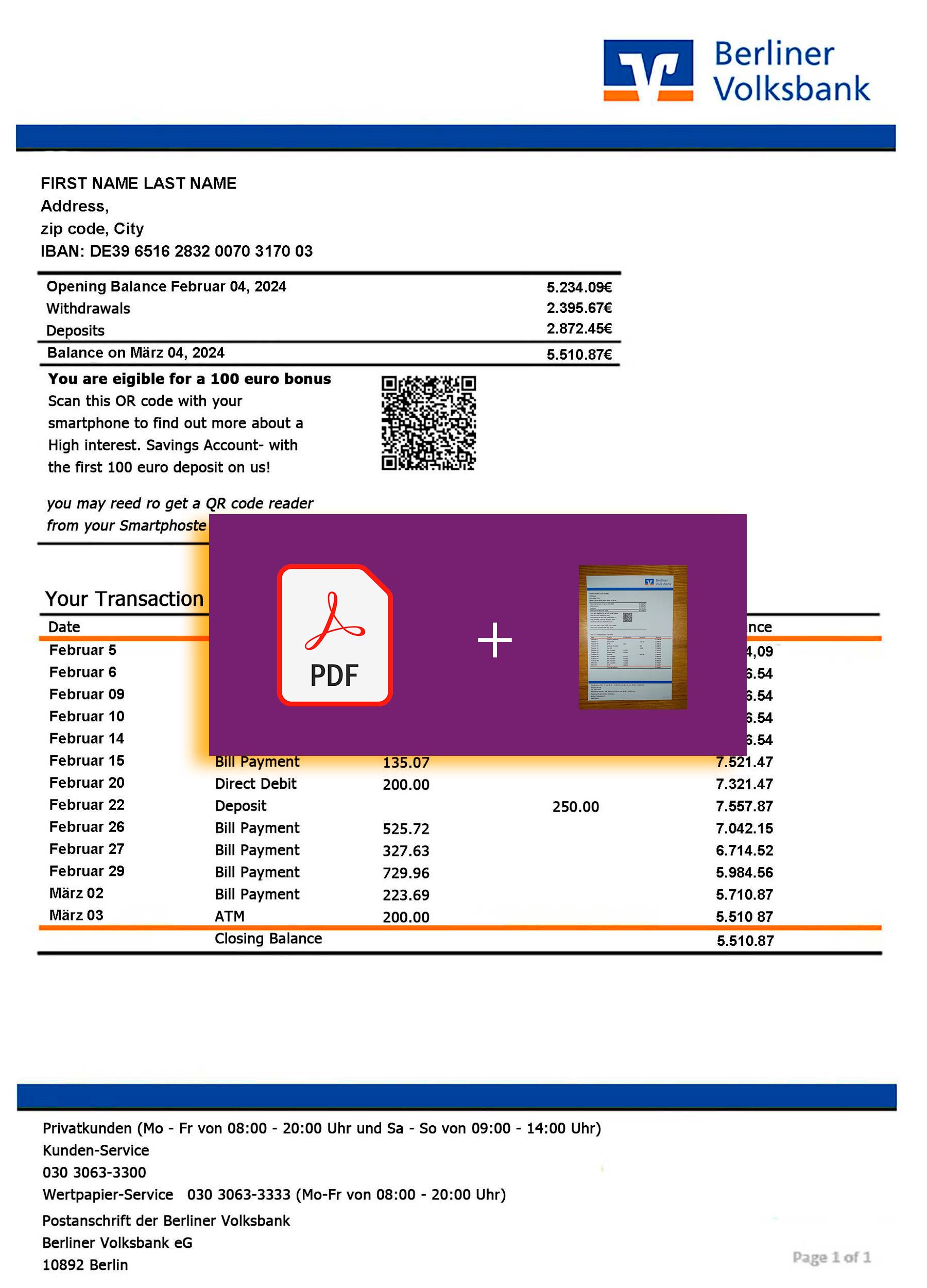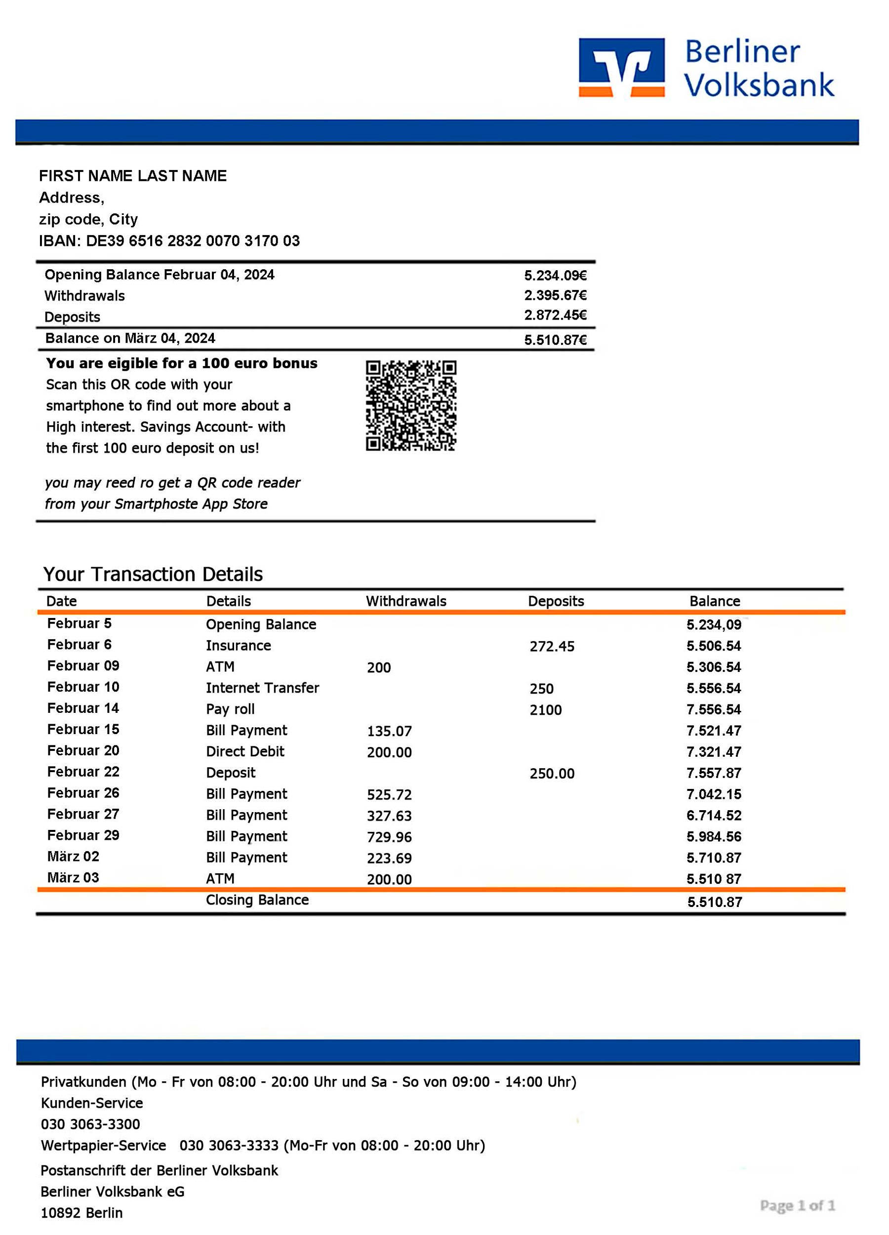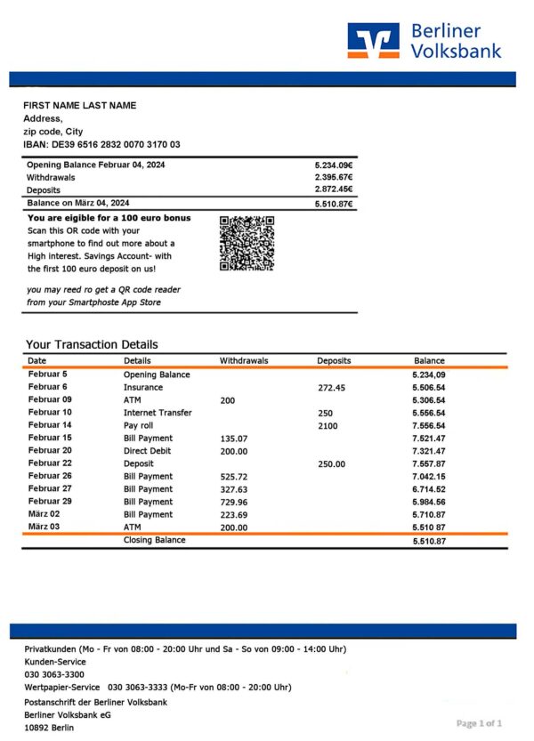 Your download includes JPEG or PDF + JPEG formats at 300 DPI resolution. The Berliner Volksbank layout maintains all standard German banking fields such as account number, IBAN, BIC, transaction history, running totals, and statement period. Each order includes free revisions until final approval, secure payment processing, and delivery within 24 hours—backed by 24/7 customer support for smooth, reliable service.