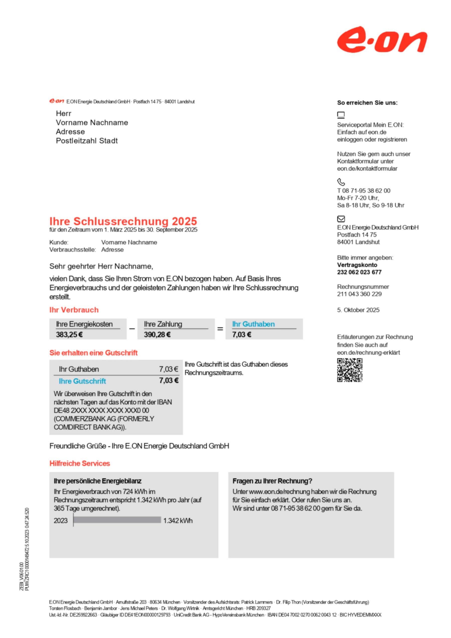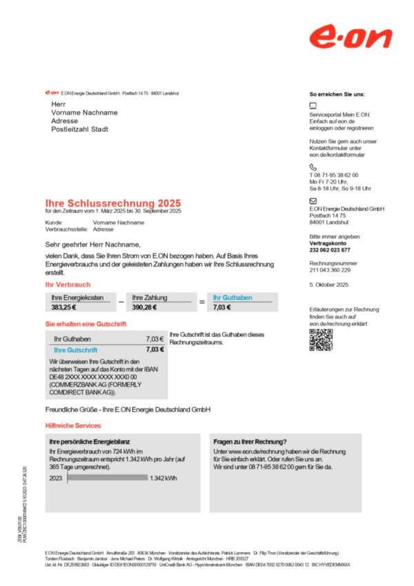 This editable E.ON electricity bill template for Germany (2025 version) is designed for professionals who require realistic, high-resolution billing layouts for documentation, compliance testing, or POA/KYC verification workflows. The file replicates the authentic German energy statement structure, featuring editable fields for billing cycles, totals, and customer details. Delivered in 300 DPI quality, it ensures clarity for both print and digital formats — ready to use, without manual design work.
