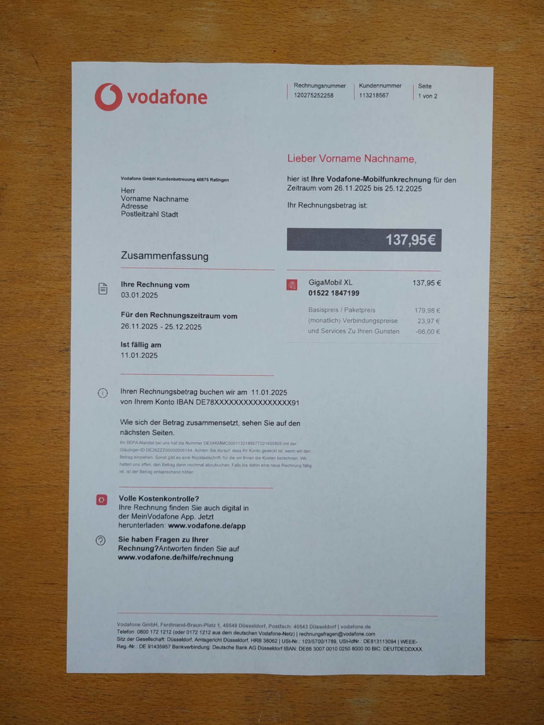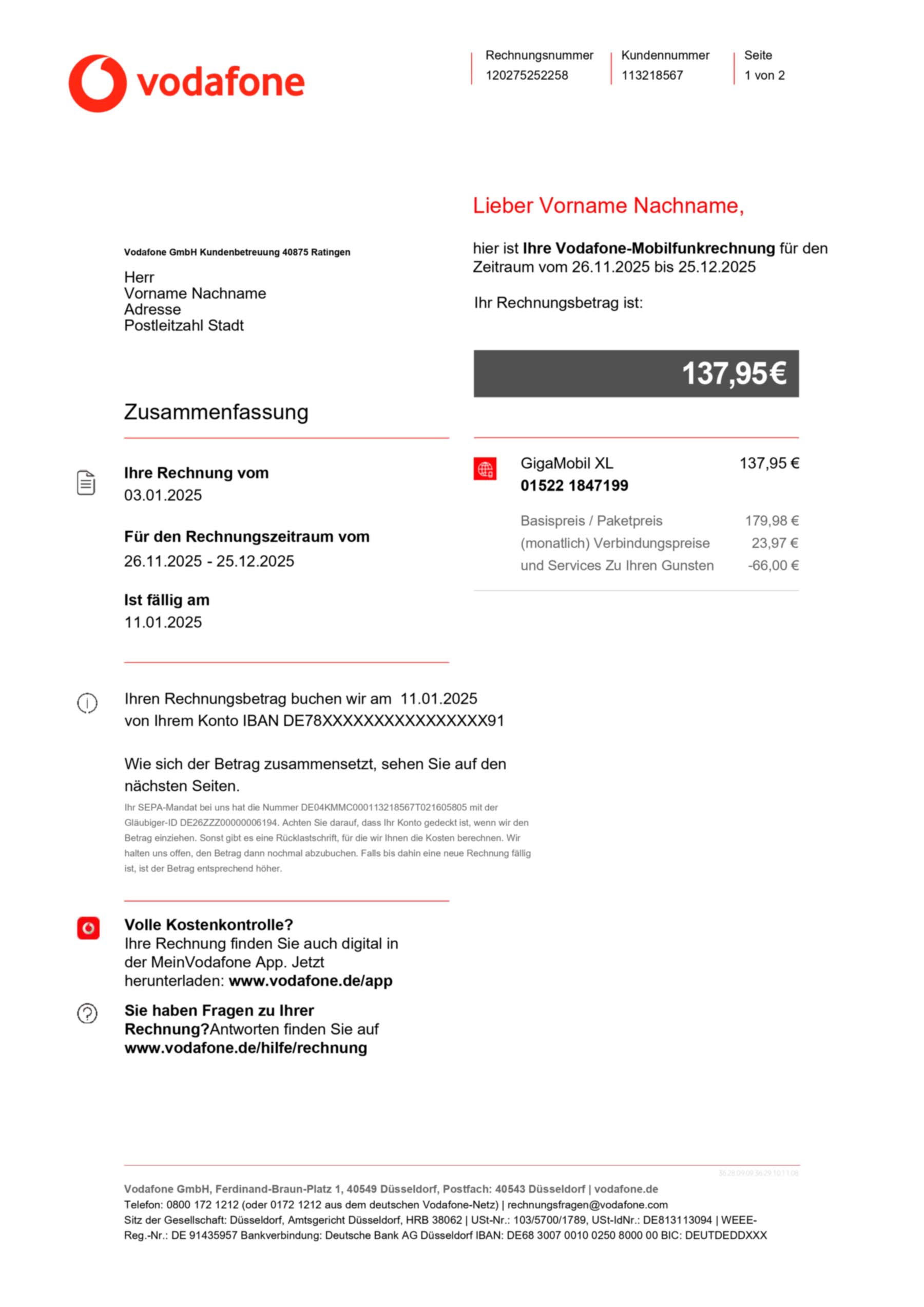 Editable areas include customer information, address, billing period, plan details, and totals. The design stays true to the Vodafone Germany statement style, optimized for use with common editing tools like Adobe Photoshop or PDF editors while maintaining full 300 DPI print quality.
