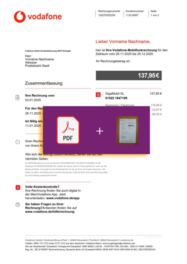 Your order includes JPEG or PDF + JPEG files in 300 DPI quality, fully aligned with the Vodafone Germany layout. Editable fields include customer name, billing address, period, usage details, and total charges. Each order comes with secure checkout, free revisions until approval, 24-hour turnaround, and 24/7 support — ensuring reliability, privacy, and professional execution.