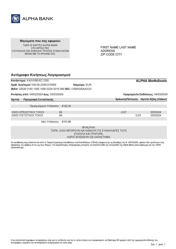 For a complete Greek-style document set, you can explore the Greece Electricity utility bill that matches Alpha Bank’s professional layout quality. It’s a great way to compare realistic visual structures across banking and energy statements for verification or UI mockup purposes.