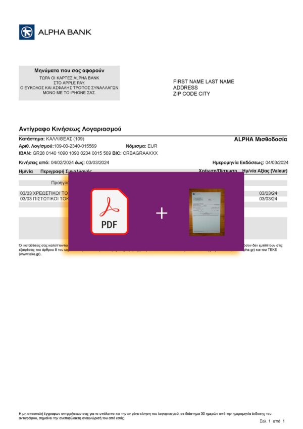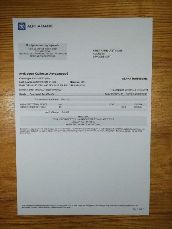 For a complete Greek-style document set, you can explore the Greece Electricity utility bill that matches Alpha Bank’s professional layout quality. It’s a great way to compare realistic visual structures across banking and energy statements for verification or UI mockup purposes.