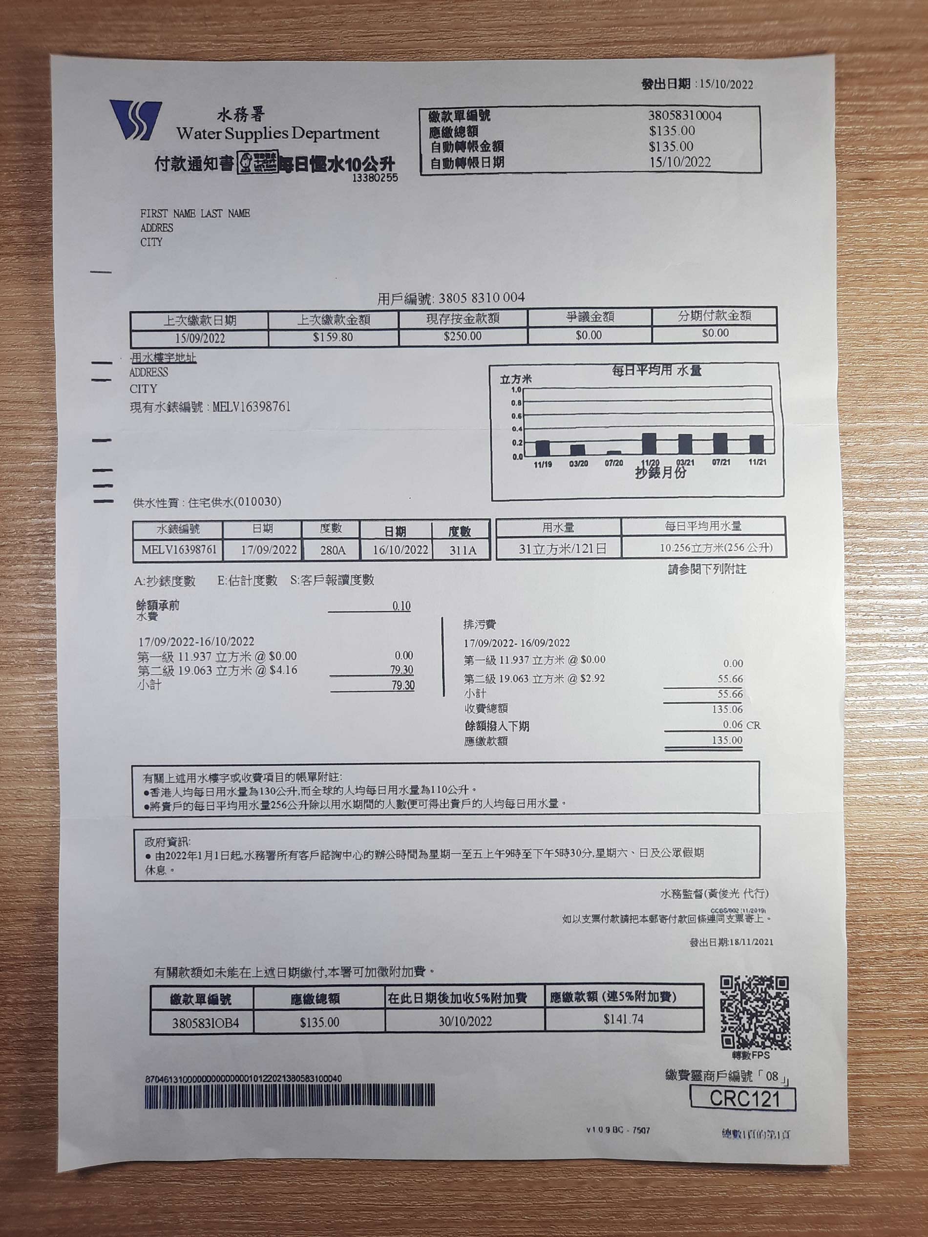 Your package includes JPEG or PDF + JPEG formats, each built in 300 DPI for sharp and print-ready visuals. The Hong Kong layout is aligned with the city’s standard water billing structure and includes editable areas for customer details, service address, billing period, and totals. Every order includes free revisions until approved, fast turnaround, and secure payment with 24/7 customer assistance.