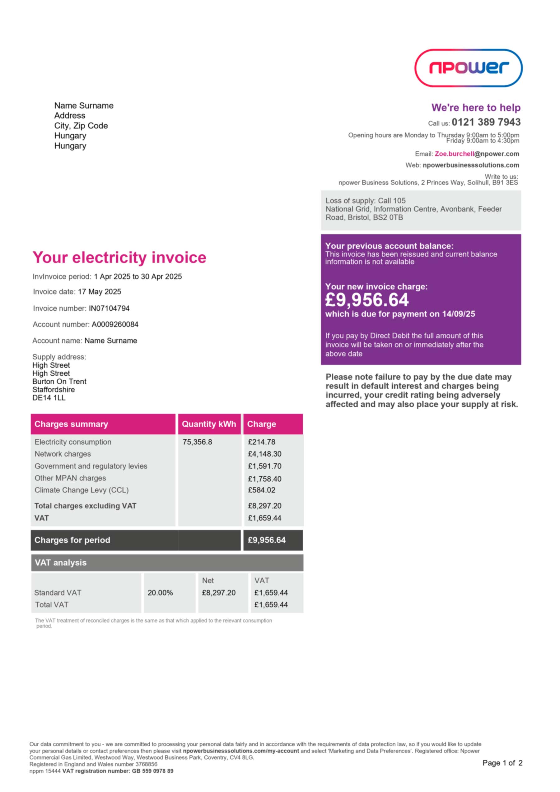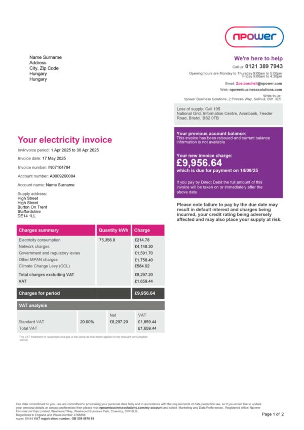 This Npower Hungary bill template is intended for lawful and ethical use only — ideal for document verification training, compliance simulations, or proof-of-address (POA) visualization within controlled workflows.