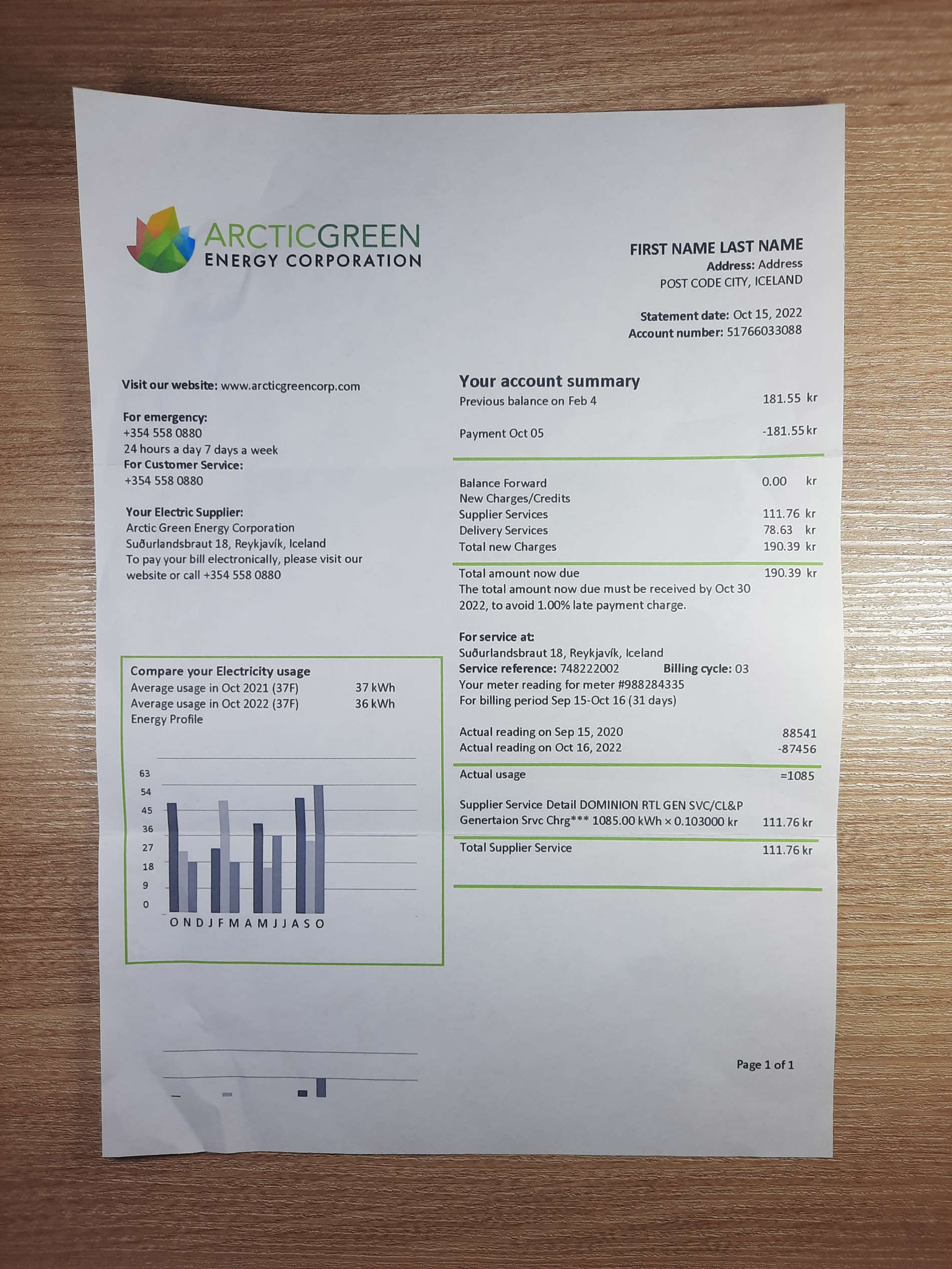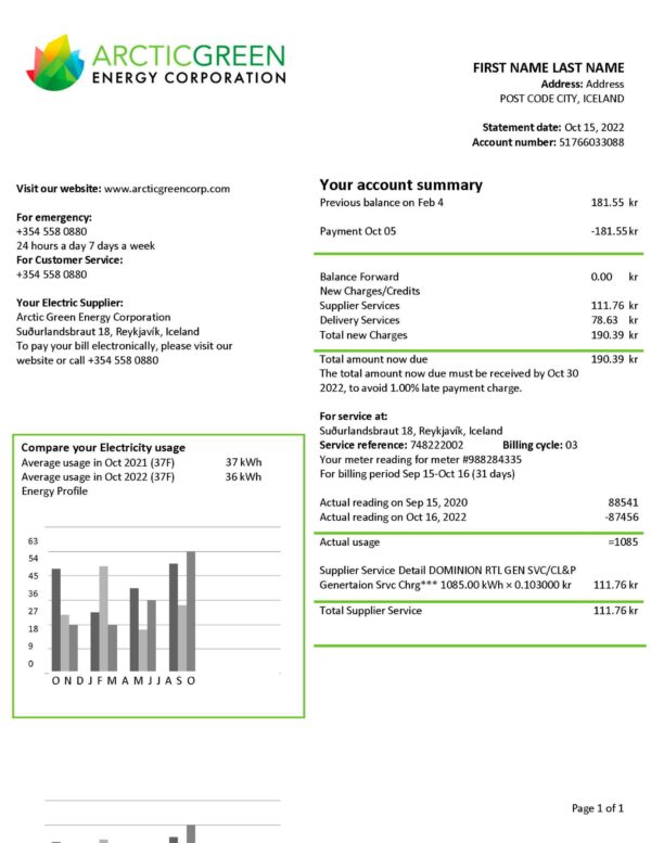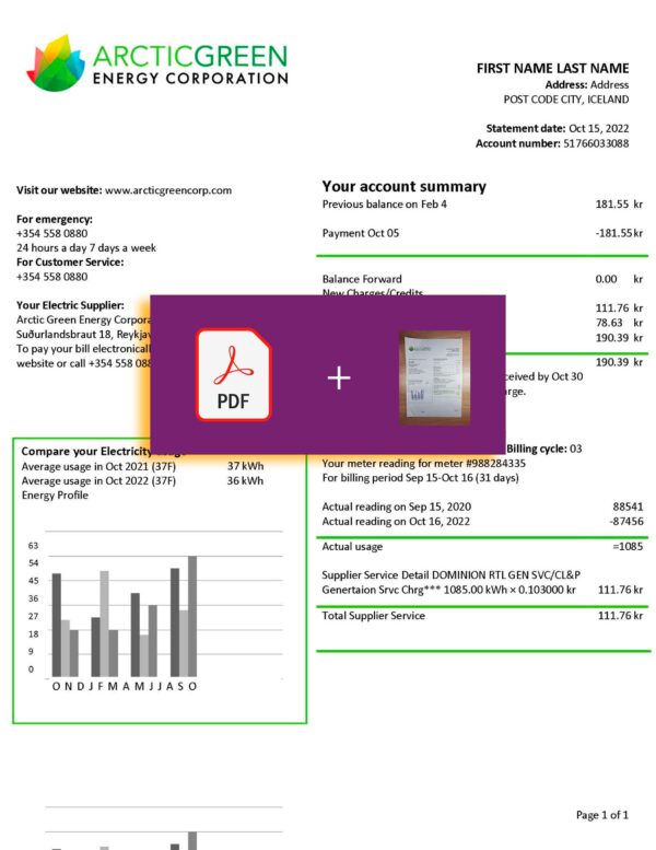 Your order includes JPEG or PDF + JPEG versions of the Iceland electric statement, with fully editable fields for customer name, billing cycle, address, and total charges. Each file follows a local-style format aligned with Icelandic energy layouts. Enjoy free revisions until you approve, fast 24-hour turnaround, and secure payment processing with 24/7 customer support.
